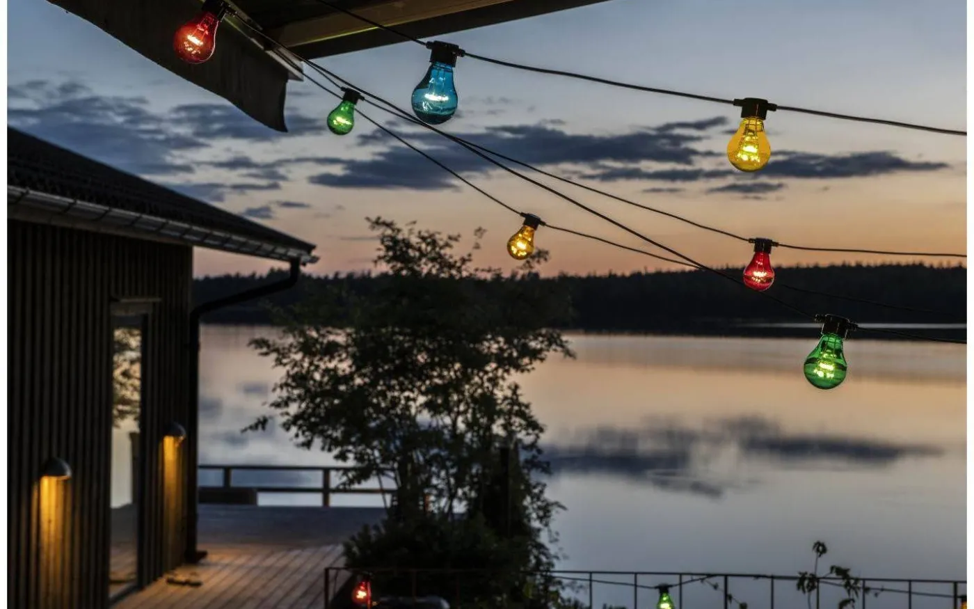 Denna festliga partyslinga från Konstsmide är 4,5m lång med 10st färgade lampor. Slingan är IP44 klassad vilket innebär att denna går att hänga utomhus. Perfekt att dekorera med till årets alla festligheter!
