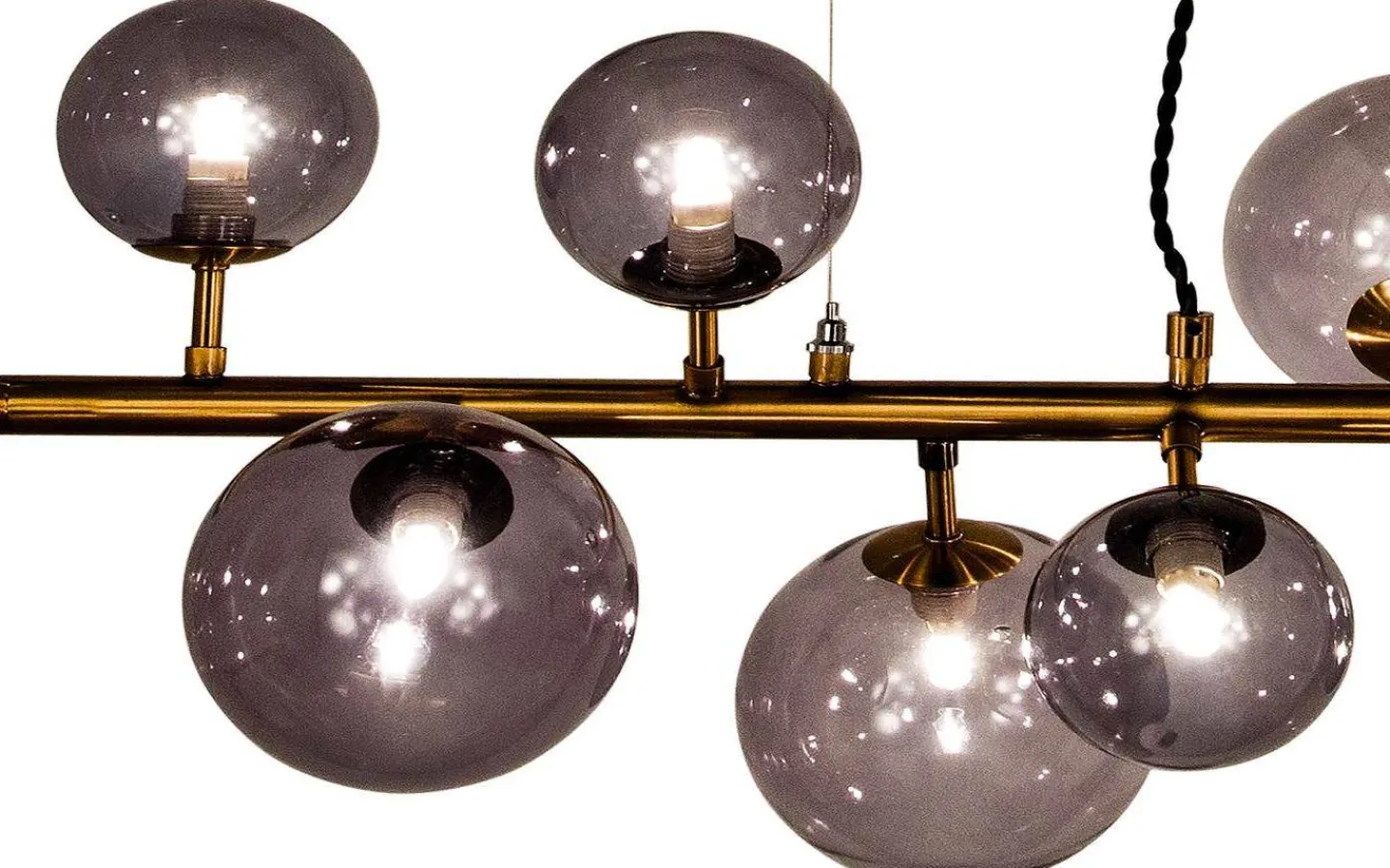 Häftiga Molekyl taklampa, från Aneta Belysning, är en härlig taklampa med stomme i antikfärgad metall kombinerat med nio glasglober med rökfärgat glas. Glasgloberna är i två olika storlekar vilket gör att lampan får en intressant och levande design. Då glasen är handblåsta är varje glas unikt och luftbubblor och små ojämnheter kan förekomma, som en del av det genuina hantverk som tillverkningsprocessen kräver och som blir del av lampans charm och karaktär.