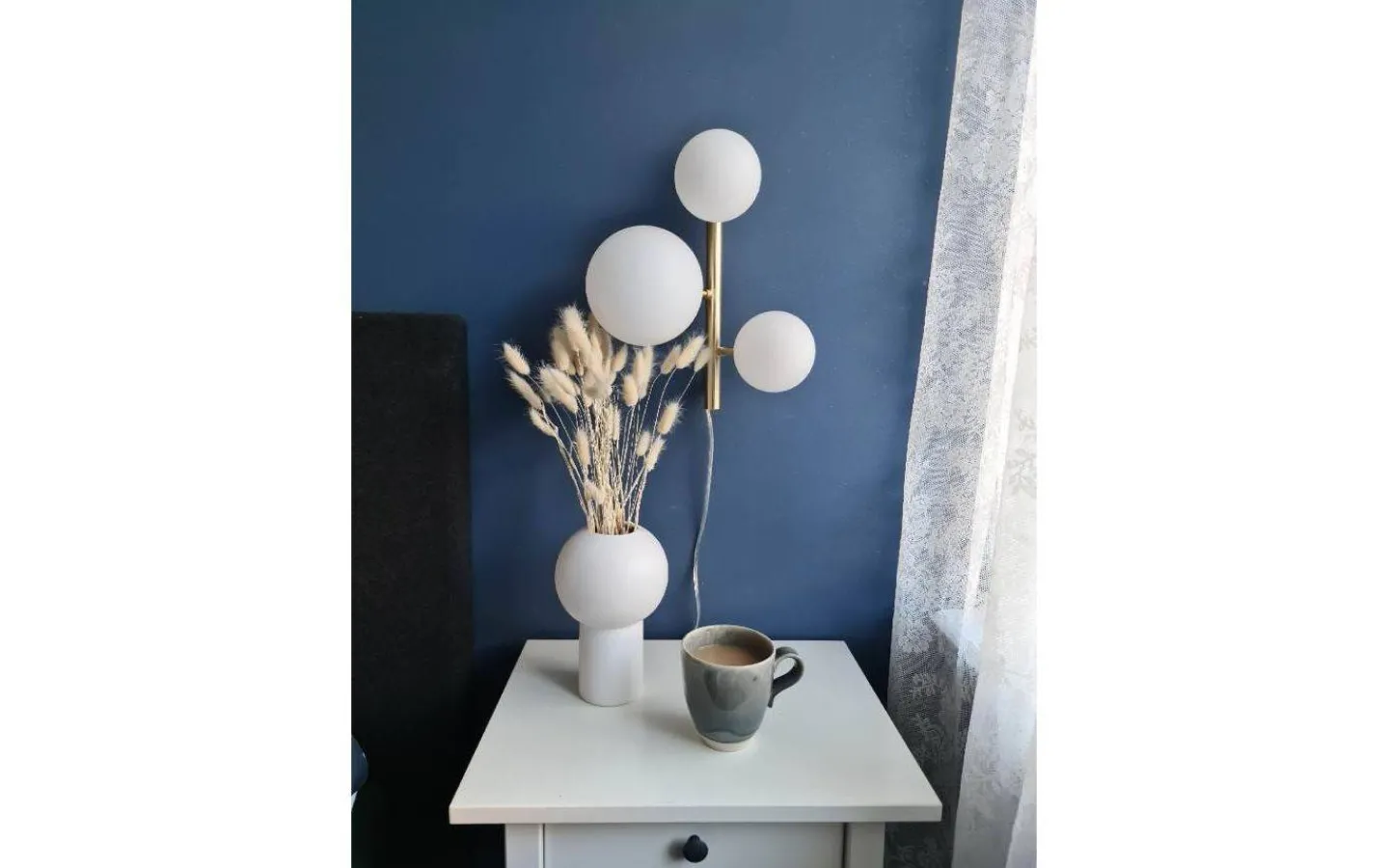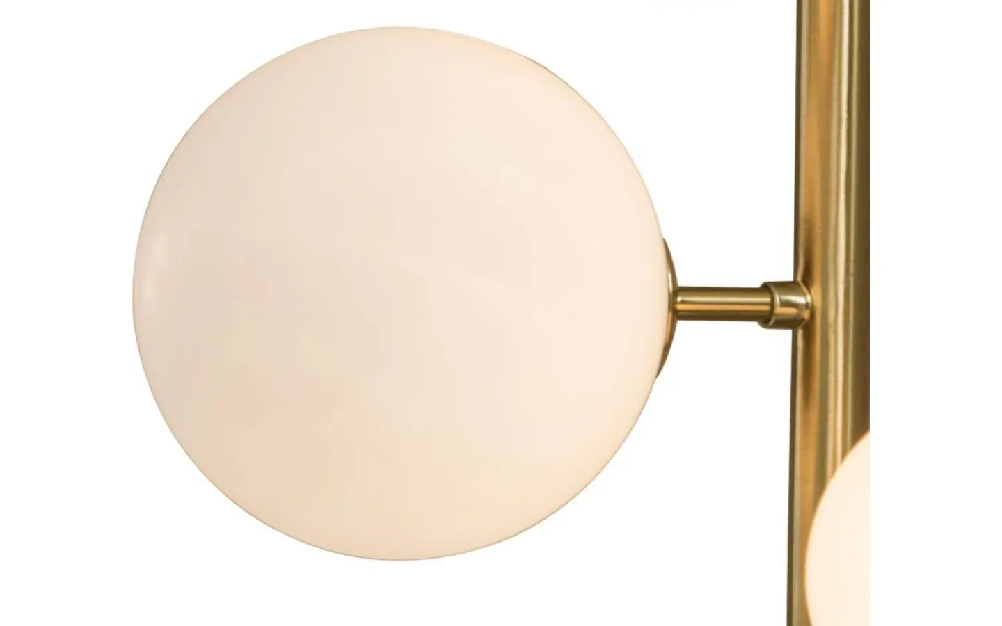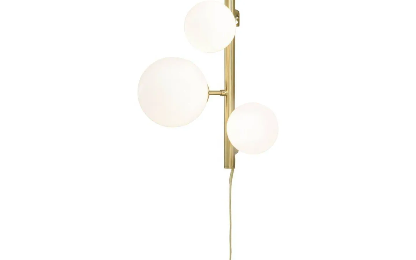 Molekyl vägglampa i mässingsfärgad metall med 3 vita glaskulor. Max 3x25W G9, ingår ej. Dimmer på sladden och anslutning med stickpropp. Modern och dekorativ belysning.