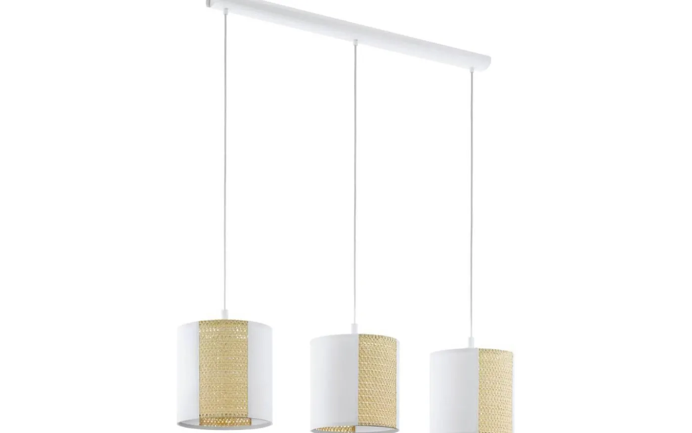 Arnhem taklampa från Eglo är en avlång taklampa med stomme i stål med tre nedpendlade lampskärmar i vacker kombination av papper och sjögräs.