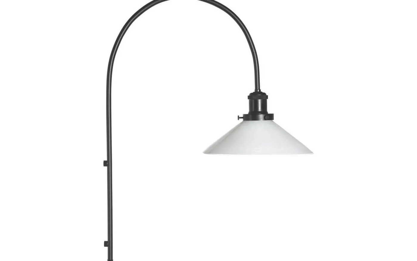 August vägglampa från PR Home har en svart metallbåge med skärm i glas. Vägglampan monteras enkelt på väggen med ett stilrent fäste som skruvas fast.