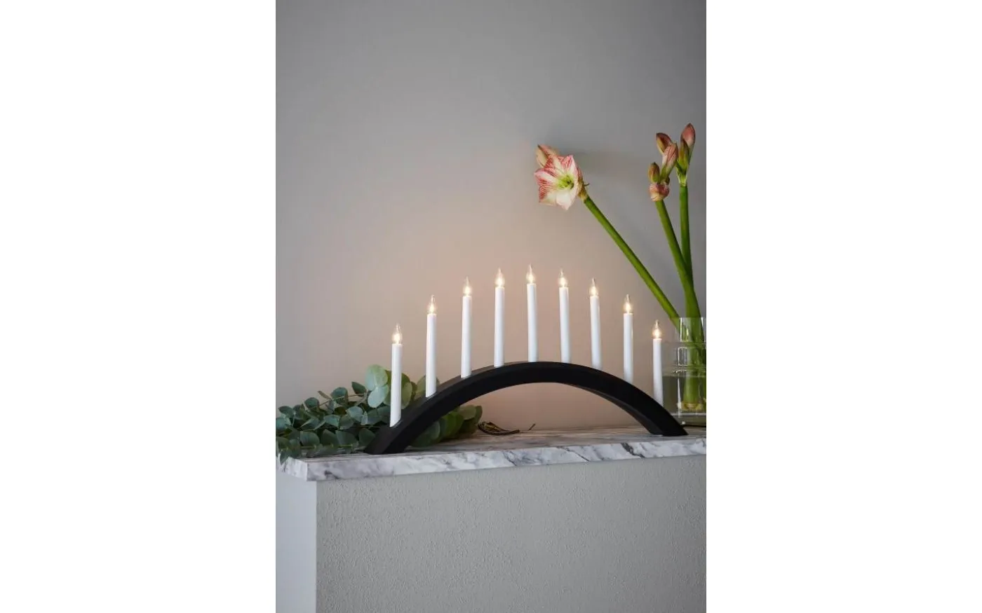 Svart bågformad adventsljusstake med nio ljuskällor. Ljusstaken har en bredd på 67 cm och passar i alla hem. Tekniskt: Ljusstaken kräver nio glödlampor med E10-sockel om max 3W, ingår. 2m lång sladd med strömbrytare.