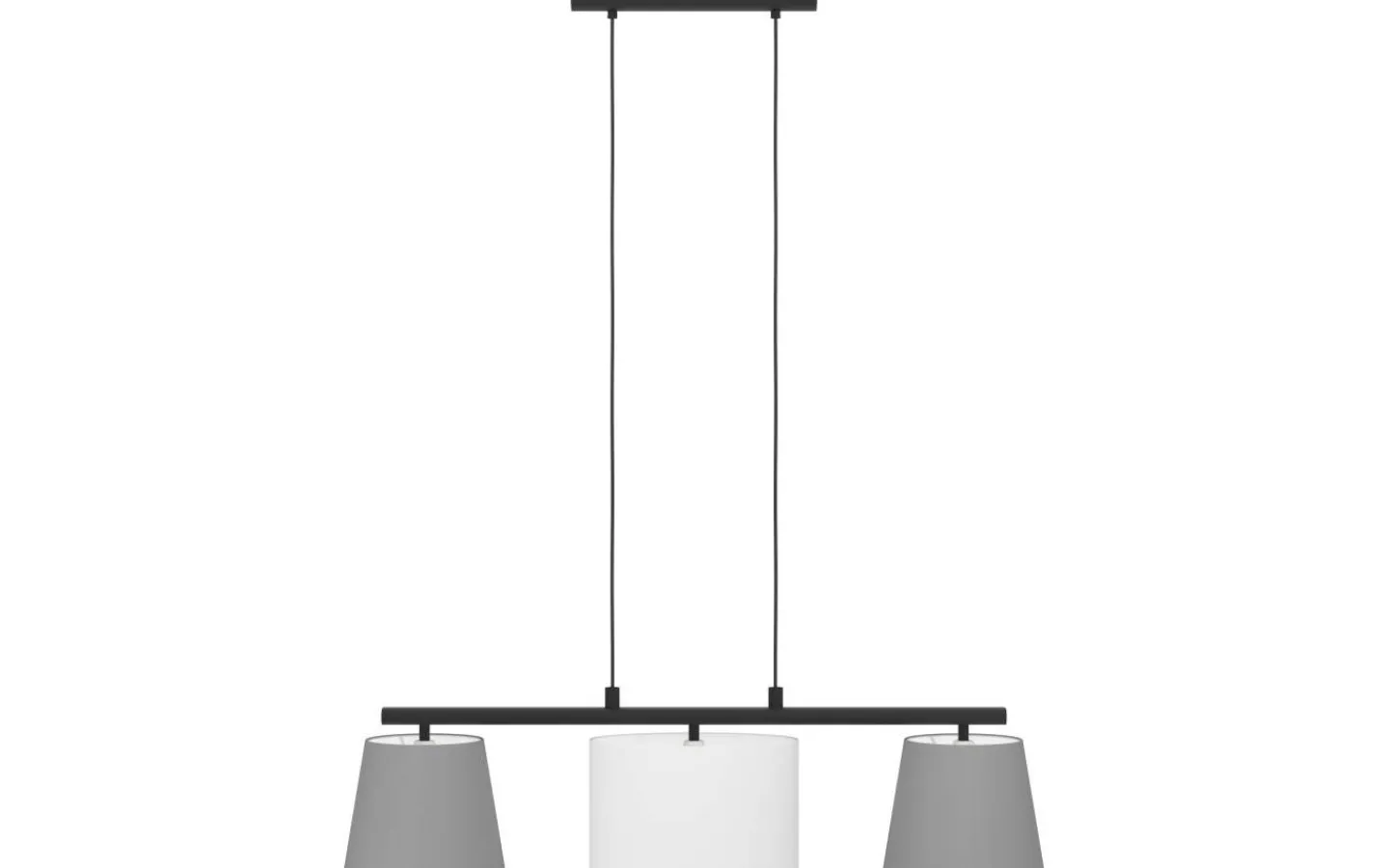 Pendellampan ALMEIDA 1 har ett metalltak i svart försett med ett avlångt, hängande metallfäste i samma färg och tre tygskärmar. De tre nyanserna – två i grått och en i vitt – skapar ett attraktivt, välbalanserat utseende, förstärkt av deras koniska och ovala konturer. Pendellampan har en retro-chic look i 60-talsstil och smälter sömlöst in i moderna interiörer och ger mysig belysning i vardagsrummet eller över ett långbord i matsalen.