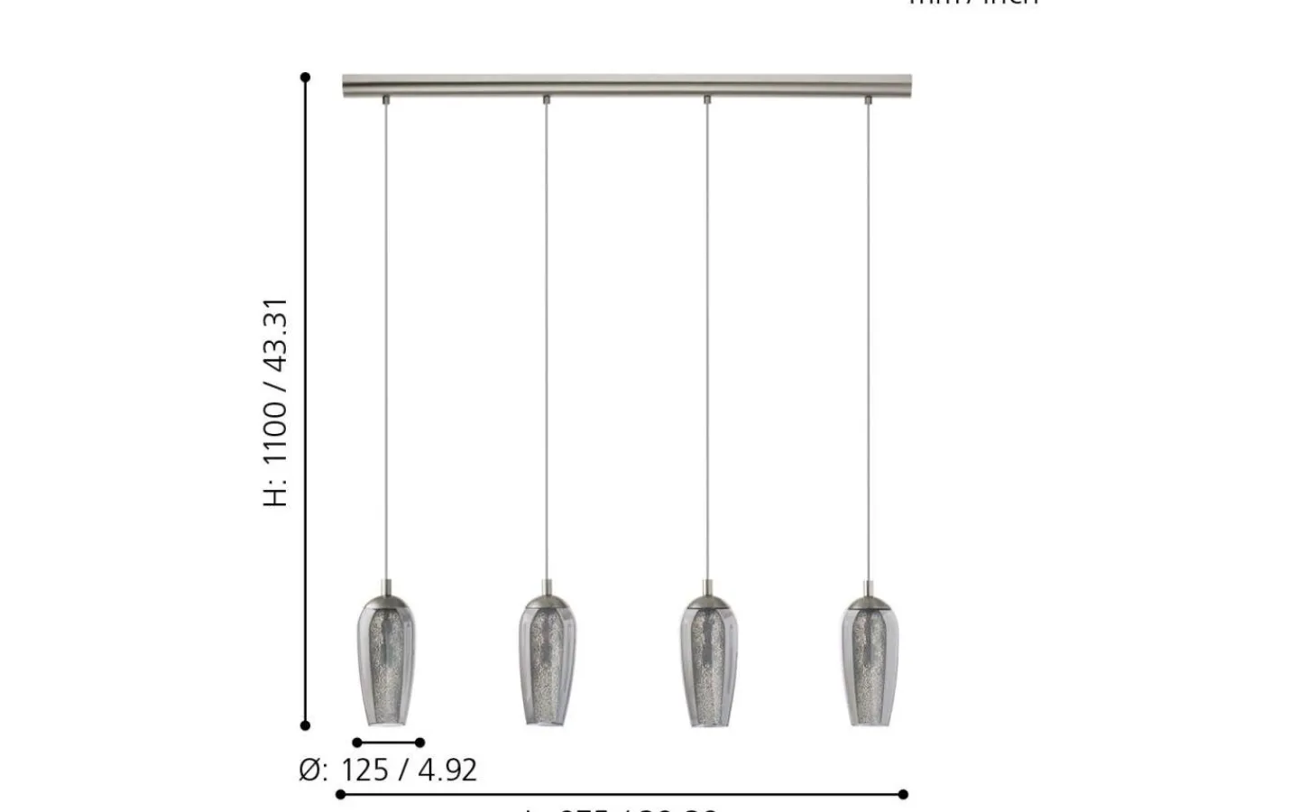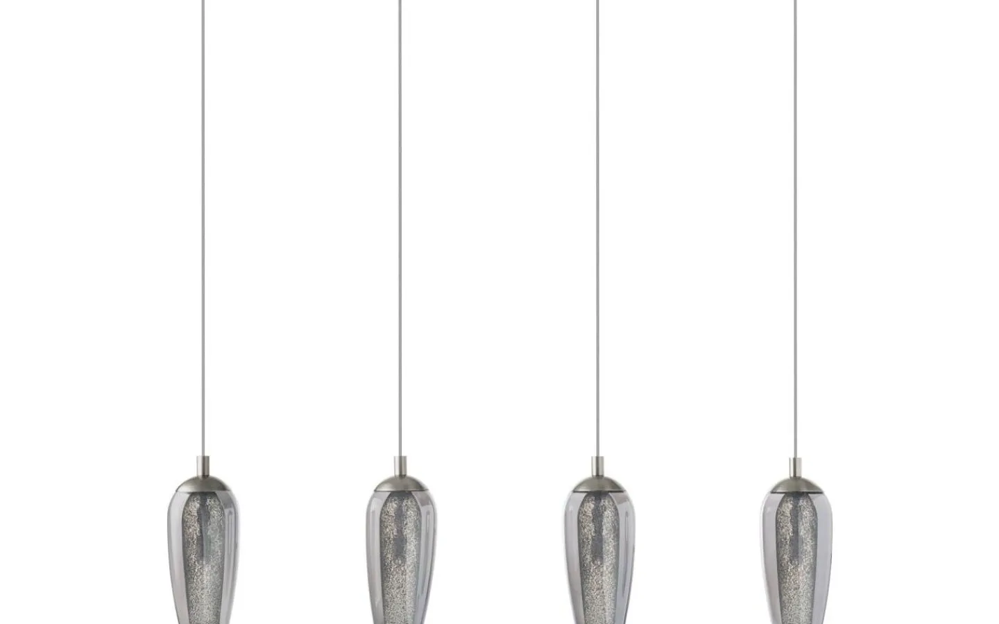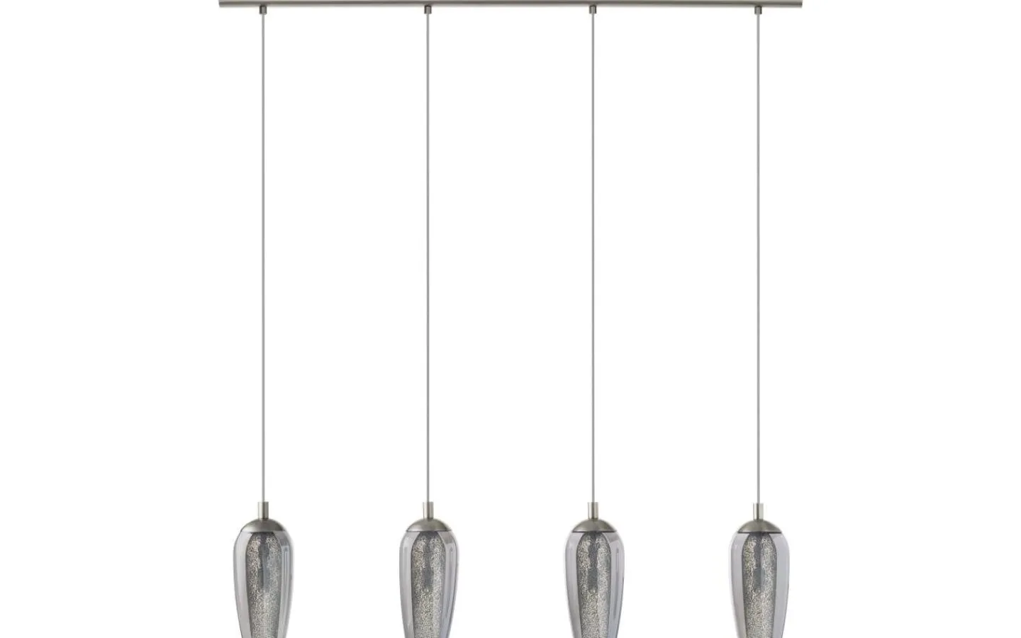 FARSALA LED-pendellampan har fyra lampskärmar gjorda av rökt svart glas, som var och en omger en skärm av klart texturerat glas. Den rektangulära baldakinen i matt nickel kompletterar pendellampans eleganta utseende på ett vackert sätt. Denna taklampa fungerar särskilt bra i moderna interiörer och skapar en distinkt belysning i vardagsrummet eller ovanför bordet i matsalen.