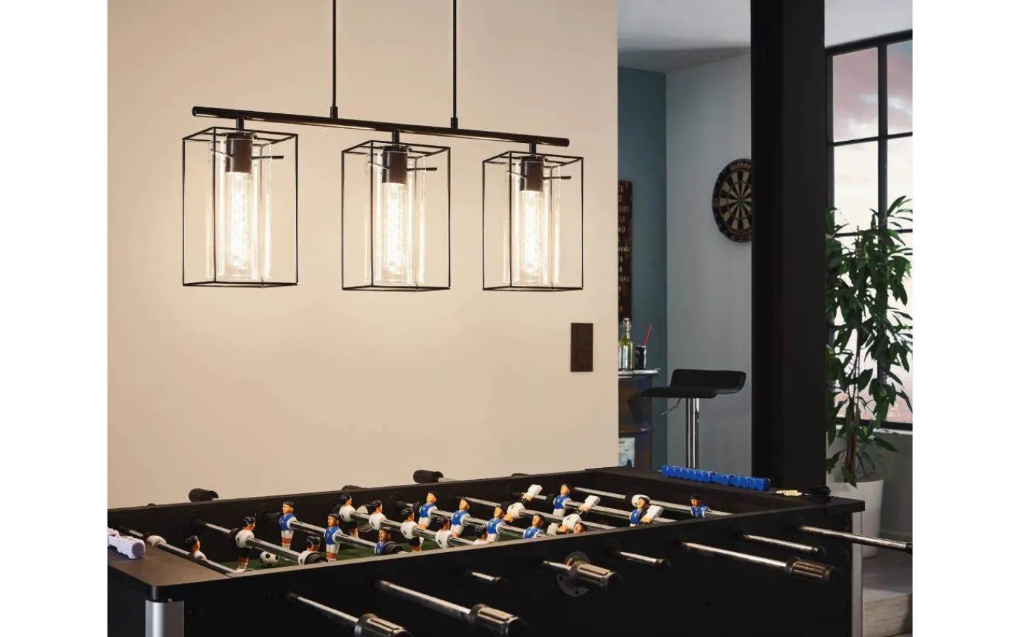 Lonico taklampa från Eglo är av stilren industiell design. Taklampan har en stomme av svartlackerat stål kombinerat med klarglas för mjukare känsla och härlig ljusspridning. Matcha lampan med en ljuskälla av rör- eller lyktform för ett riktigt bra resultat.
