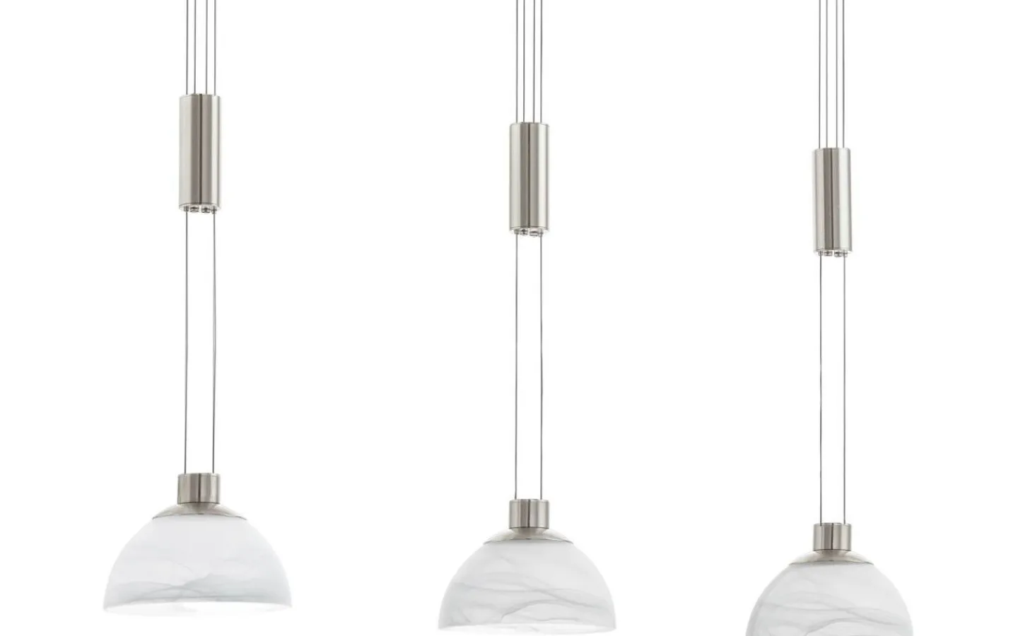 Denna nedpendlade armatur från MONTEFIO-serien är gjord av satin nickel rostfritt stål och vitt alabasterglas. Den är justerbar i höjdled, har skyddsisolering och är utrustad med tre utbytbara LED-lampor för ett varmvitt ljus.