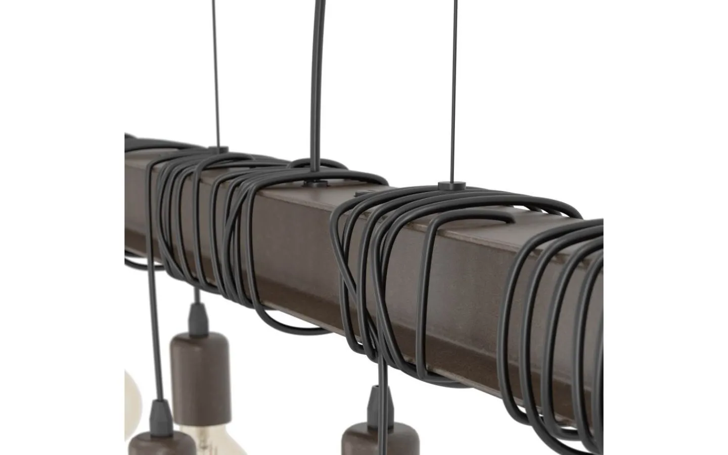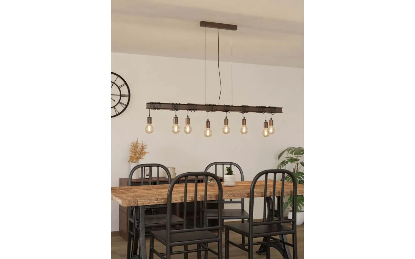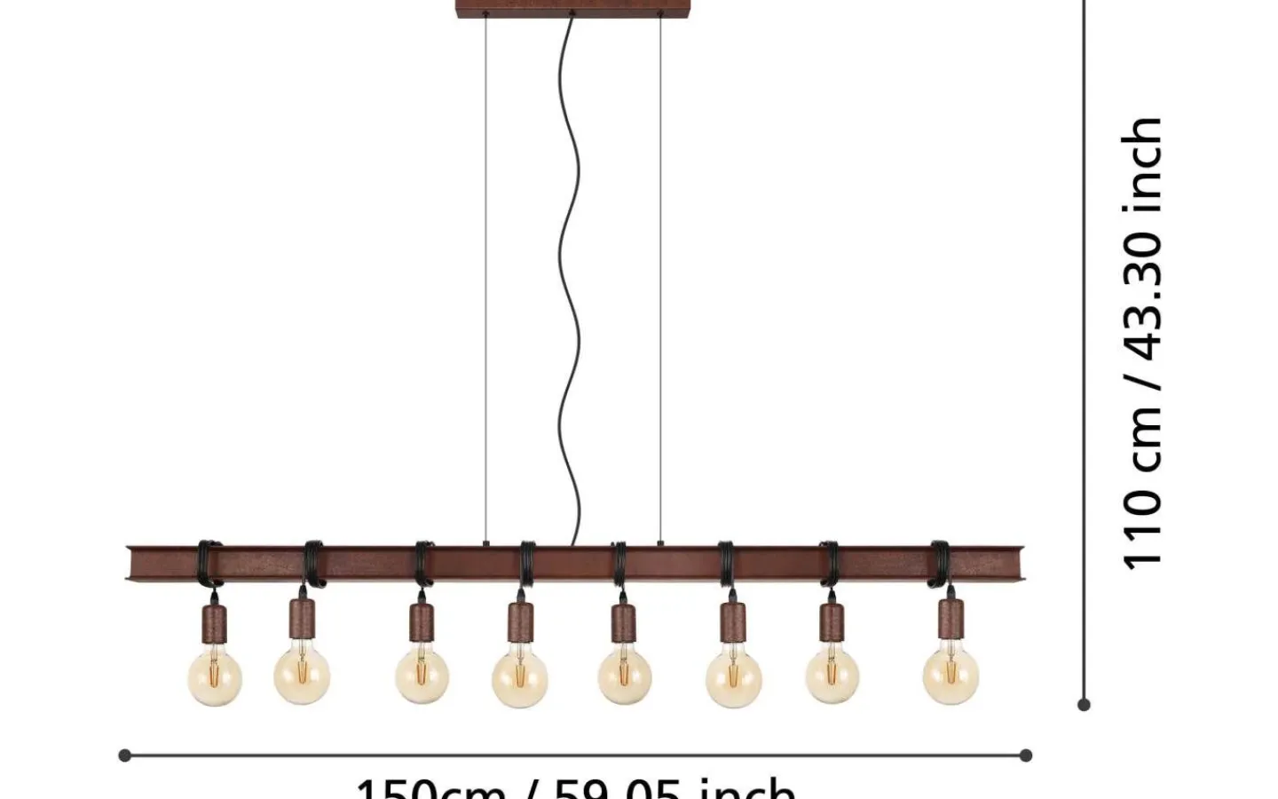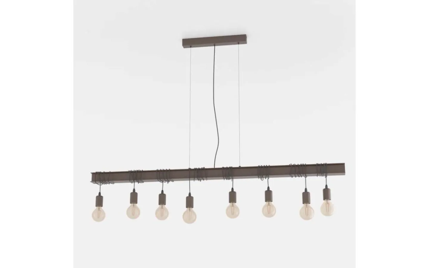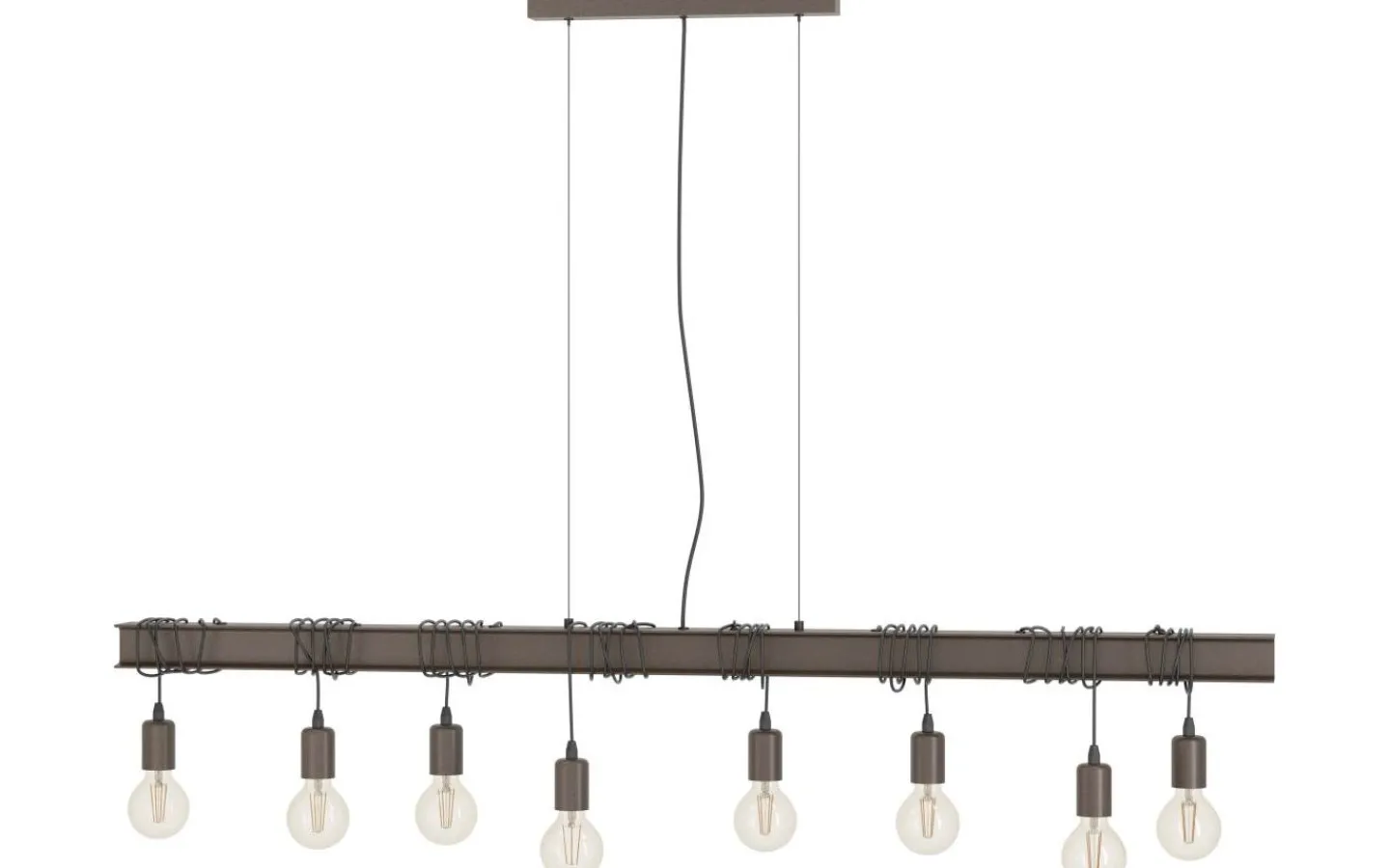 Pendellampan TOWNSHEND 4 har en antikbrun metallbalk och åtta antikbruna lamphållare. Lamphållarna är upphängda i olika höjder och kan bytas genom att linda eller varva upp repen. Med sitt industriella utseende kompletterar taklampan moderna interiörer och ger distinkt belysning för alla utrymmen, oavsett om det är i vardagsrummet eller över ett långbord i matsalen.