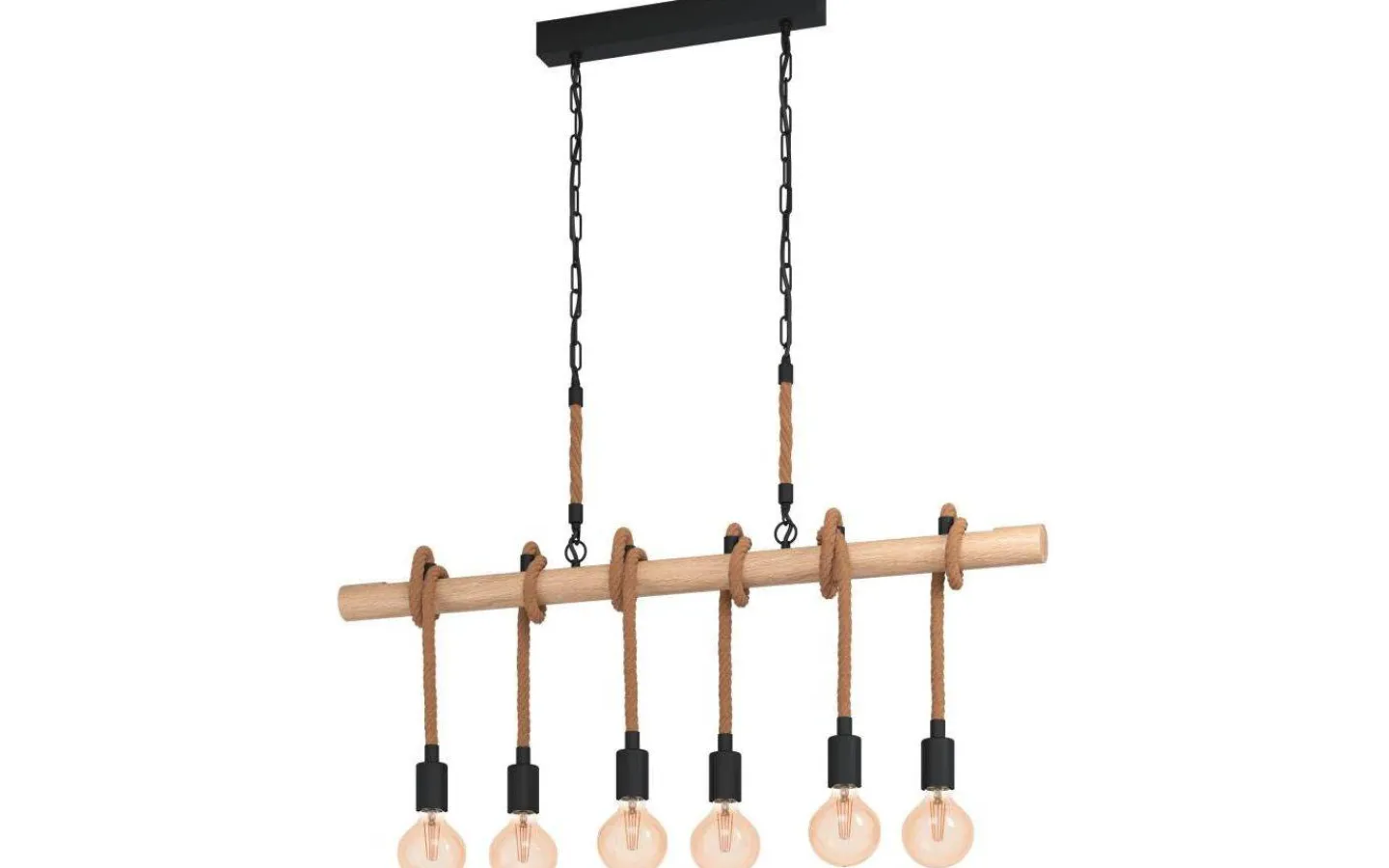 Tuffa Youngstown taklampa från Eglo har en industiell touch där trä möter stål tillsammans med tjockt rep. Taklampan har en bas av stål med svarta kedjor och avslutas med en ramp av trä med 6st tjocka rep som pendlats ner och avslutas med E27 sockel. Matcha med en dekorativ ljuskälla och få dig en riktig ögonfångare!