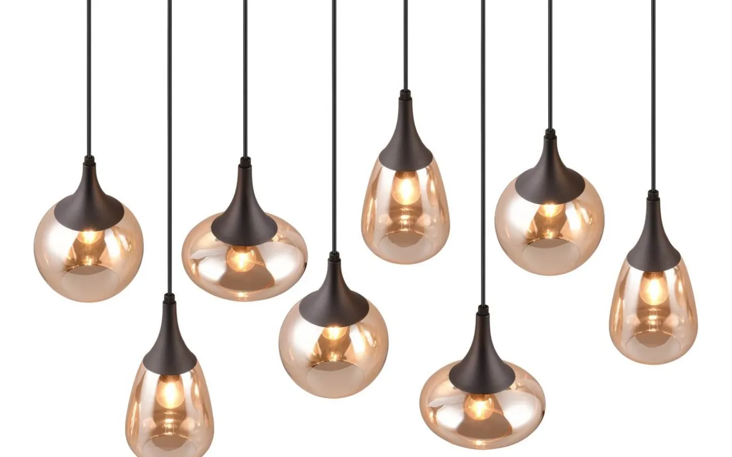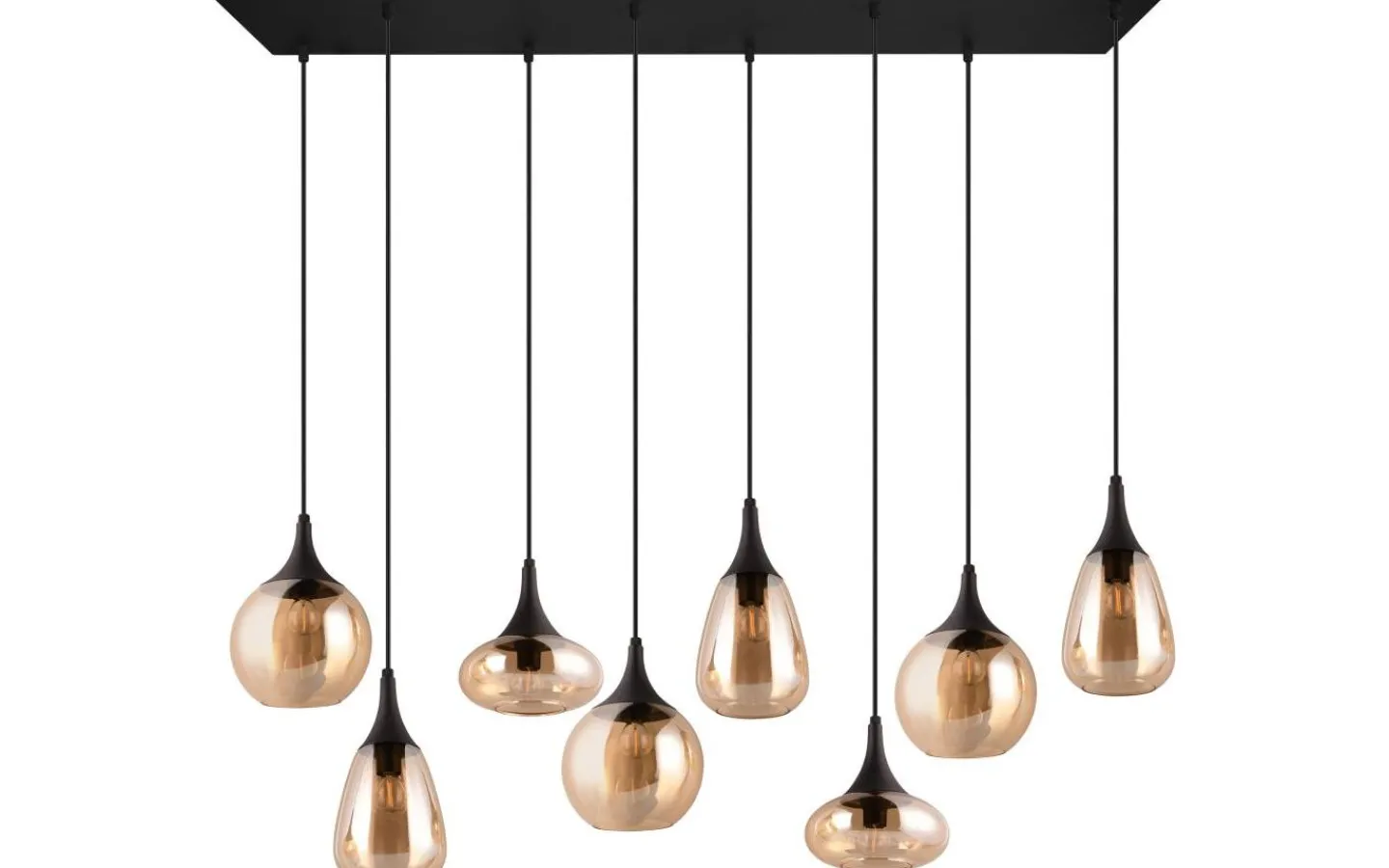 LUMINA pendellampa är ett särskilt blickfång i ditt vardagsrum tack vare sina eleganta glasskärmar! De tre skärmens olika former och sammansättningen av metall och glas skapar en vacker och unik ljusatmosfär som ger din matplats en modern touch. Tack vare det mattsvarta färgschemat och de bärnstensfärgade glasskärmarna finns det gott om utrymme för andra färger, vilket gör den underbart enkel att integrera i befintliga boendekoncept. För modern och pålitlig belysning rekommenderas användning av en LED-lampa. Den erbjuder hög ljuskvalitet, är mångsidig och övertygar med jämn belysning. Dess långa livslängd och låga värmeutveckling gör den till det perfekta valet för en mängd olika användningsområden. Ljuskälla: exklusiv 8x E14 · max. 40W. Extra information: Justerbar i höjd, Takmontering, IP20, Lampa(or) ingår ej