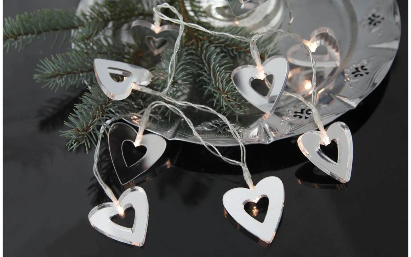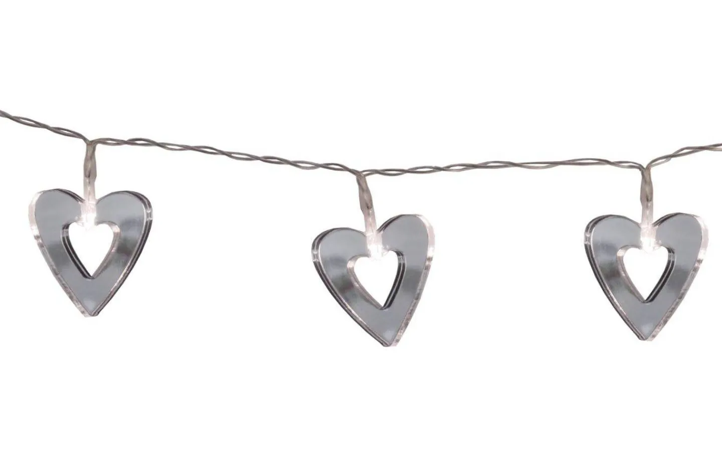 Fin, batteridriven ljusslinga med hjärtan i akryl med spegelfinish och transparent sladd. Inne i varje hjärta finns en liten LED-lampa som avger ett mysigt ljussken. Då ljusslingan drivs med batteri är den enkel att dekorera med, pynta en bröllopsdukning, låt den hänga runt en spegel eller i ett blomsterarrangemang.