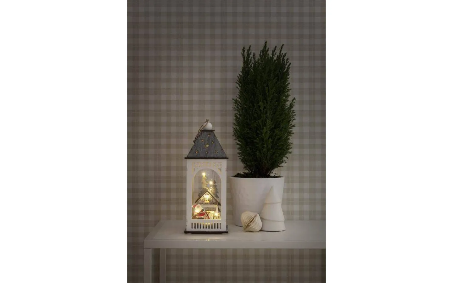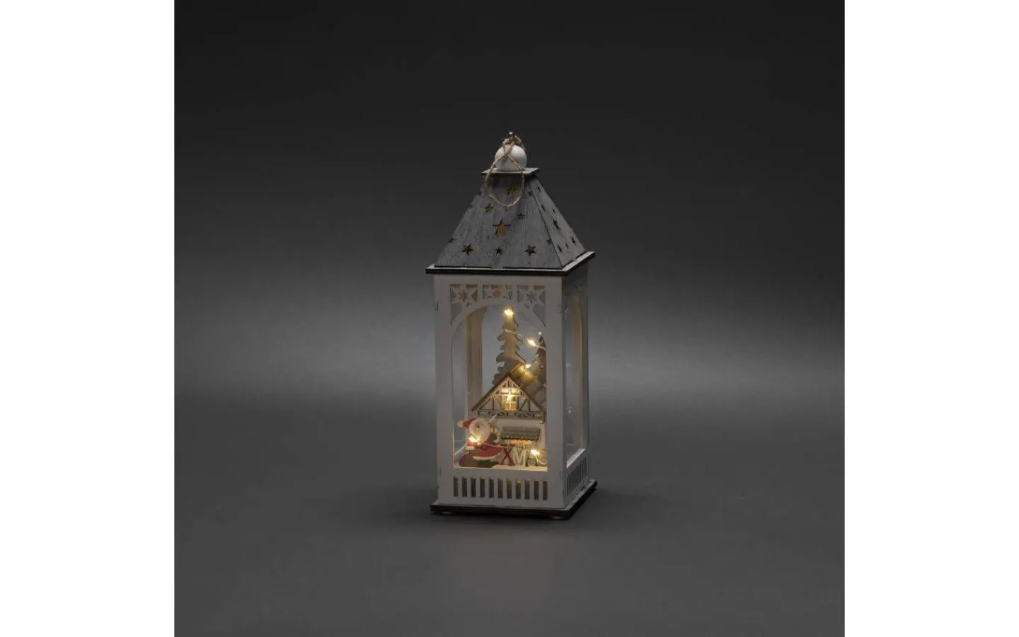 Dekorativ ljuslykta i trä från Konstsmide. Inuti ljuslykta lyser en vacker stuga upp i ett härligt varmvitt ljussken.