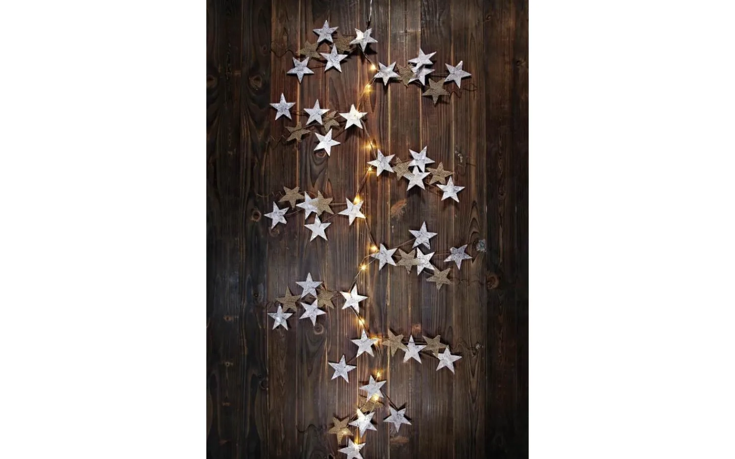 Gren, dekorationsslinga från Markslöjd. Björk material med dekorationer. 20 varmvitt LED-ljus max 0,8W. Batteridriven 3×1,5V AA (ingår ej). Har timerfunktion.