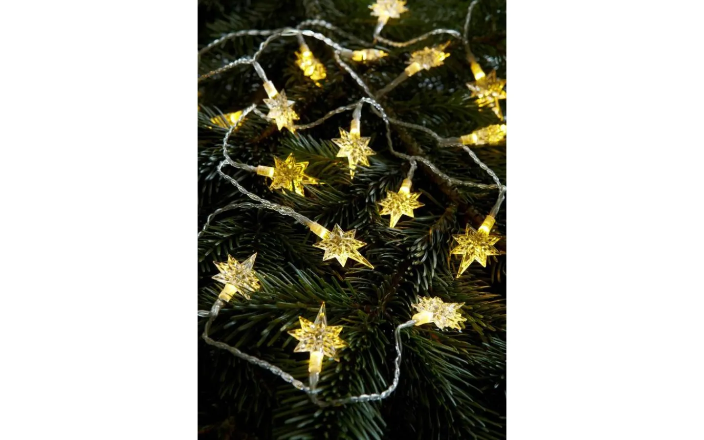 Ljusslinga med batteridrift. Den 1,9 m långa slingan har 20 st stjärnor i akryl med inbyggd LED med varmvitt sken. Tekniskt: Ljusslingan har fast LED om 1,2W och drivs av 3xAA batterier, ingår ej. Timerfunktion finns.