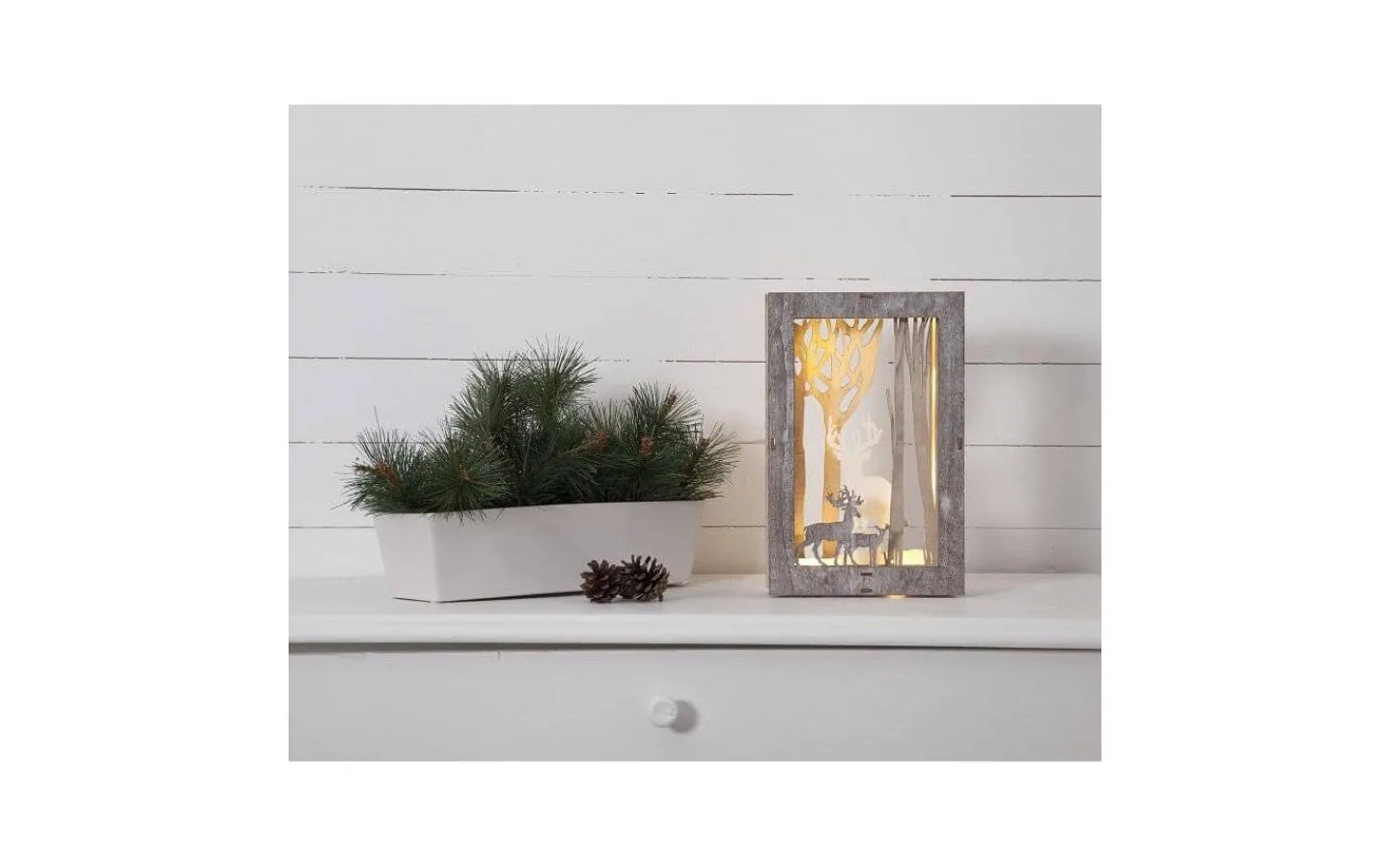 En batteridriven bordsdekoration med renar som har 10 st LED-lampor som ej är utbytbara och lyser med ett varmvitt sken.