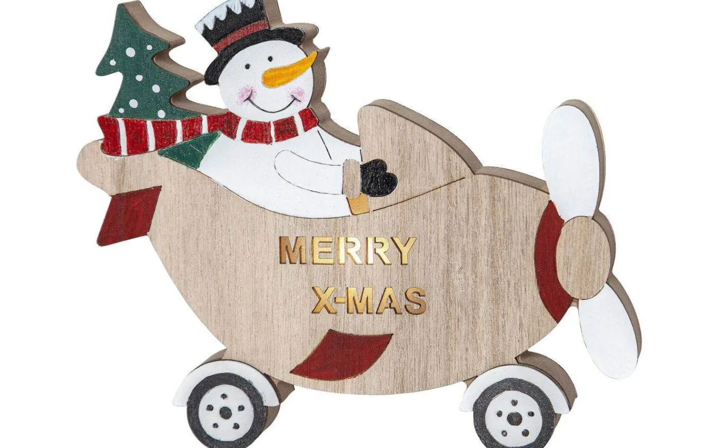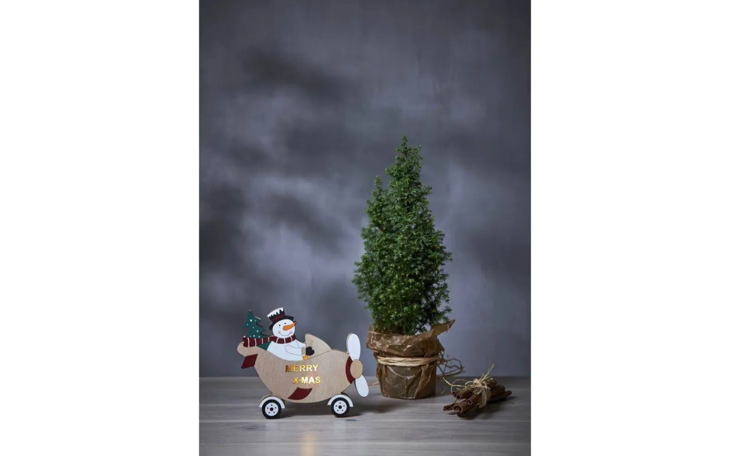 Batteridrivet flygplan med snögubbe. Dekorationsfiguren har inbyggd LED som avger ett mysigt varmvitt sken. En härlig dekoration som sprider julstämning i hemmet!