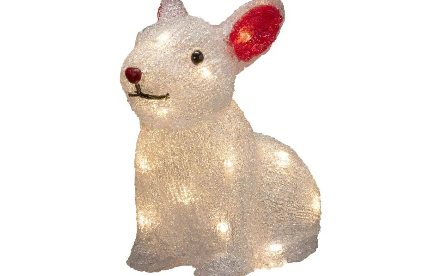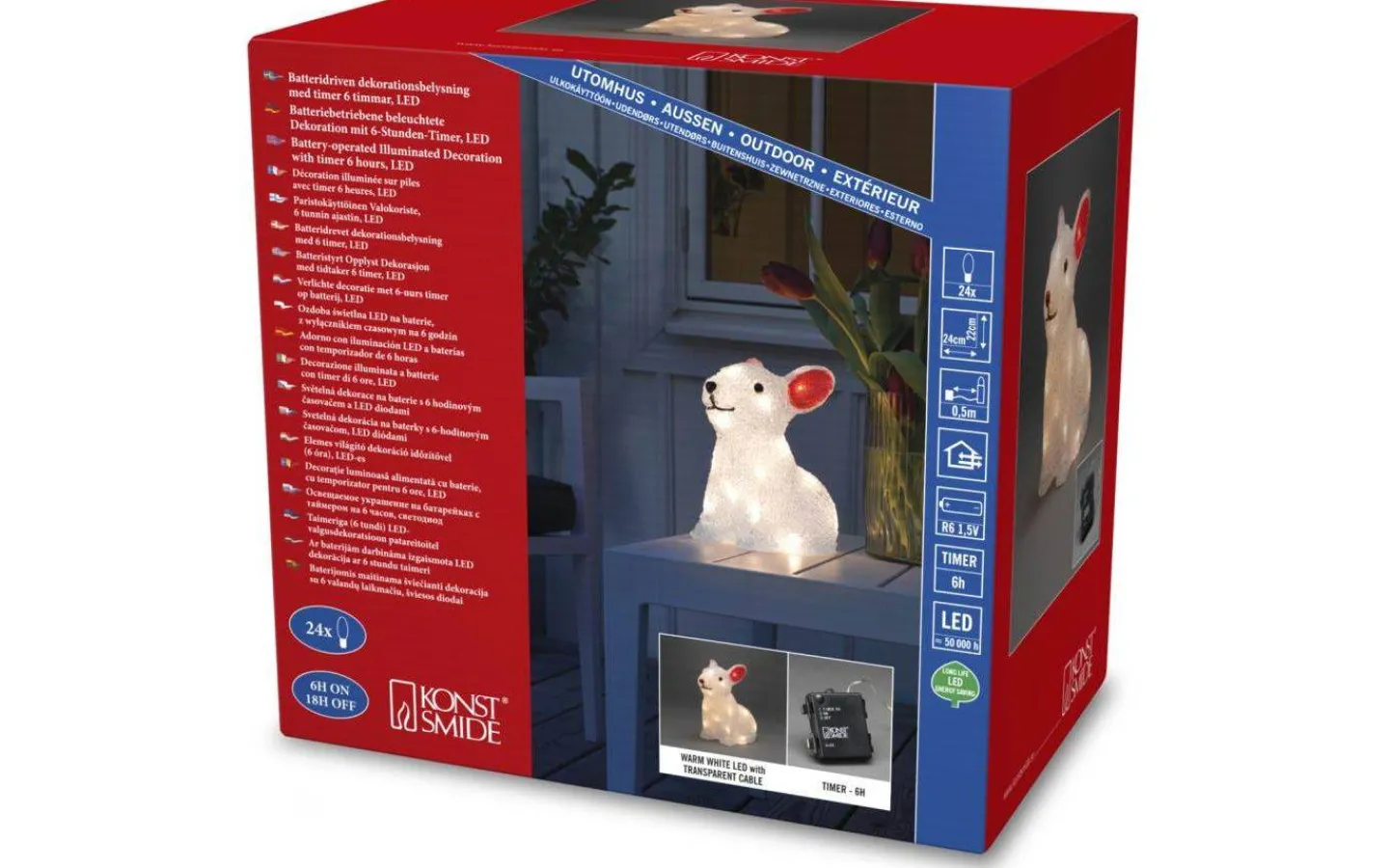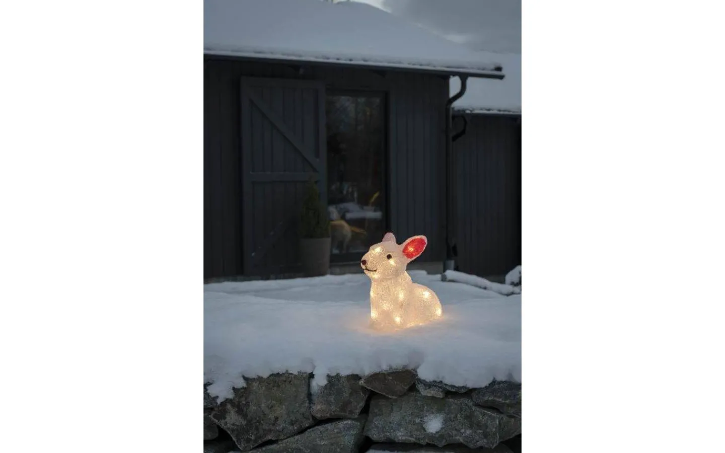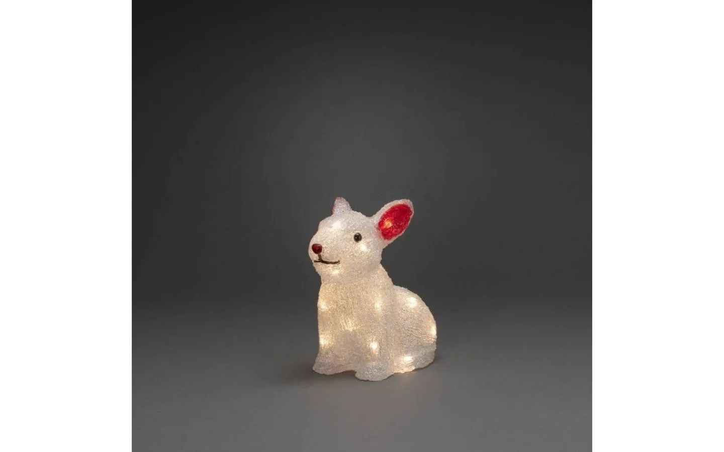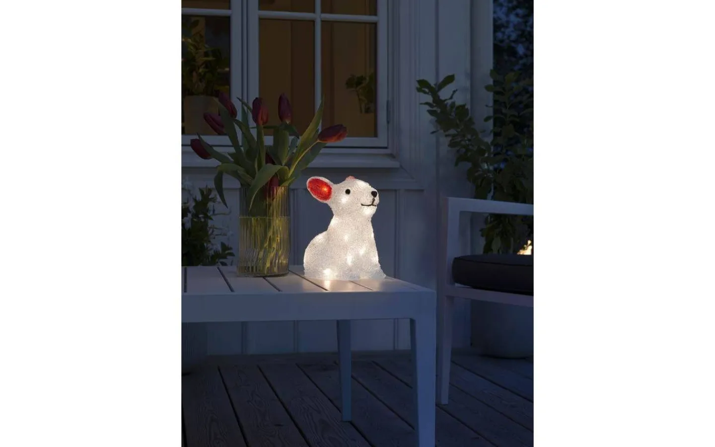 Härlig batteridriven utomhusdekoration i form av en sittandes kanin i akryl från Konstsmide. Denna utomhusdekoration har inbyggd timerfunktion vilket innebär att du tänder ljuset en gång sedan lyser det i 6h och tänds igen nästa dag vid samma tidpunkt.