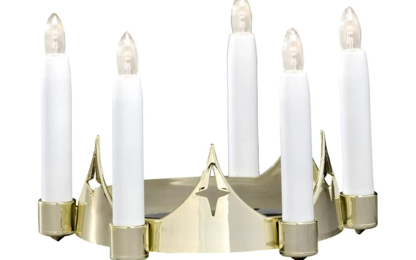 Vacker luciakrona i guld från Konstmside. Luciakronan är försedd med 5st LED-lampor som avger ett härligt ljussken. Luciakronan drivs med 5st AA-batterier, dessa köpes separat. Se passande förslag under ”Tillbehör”.