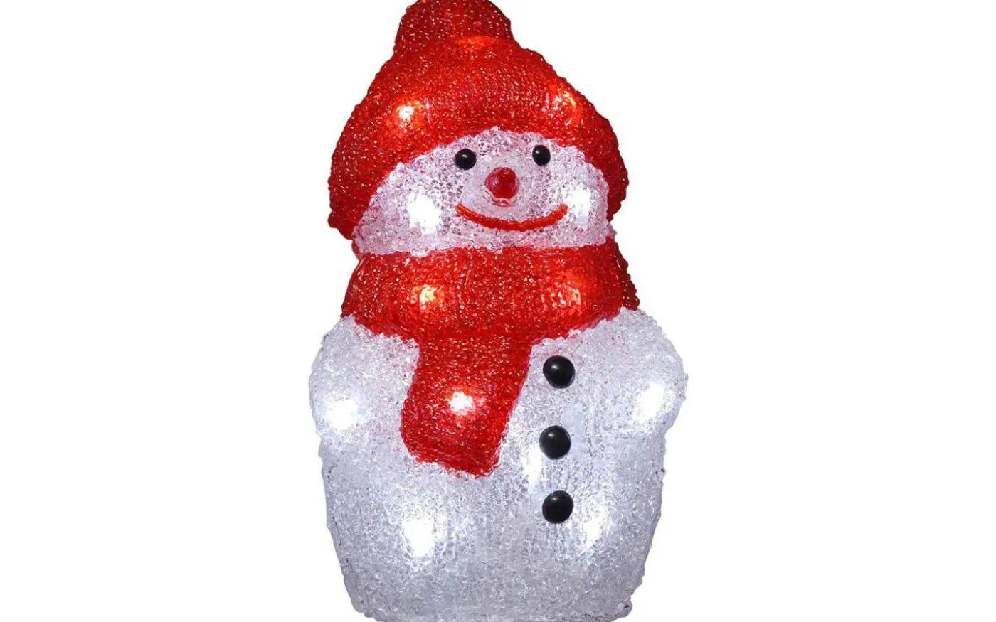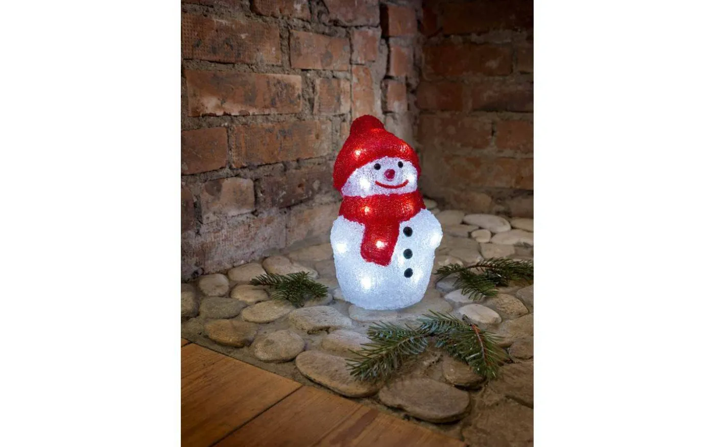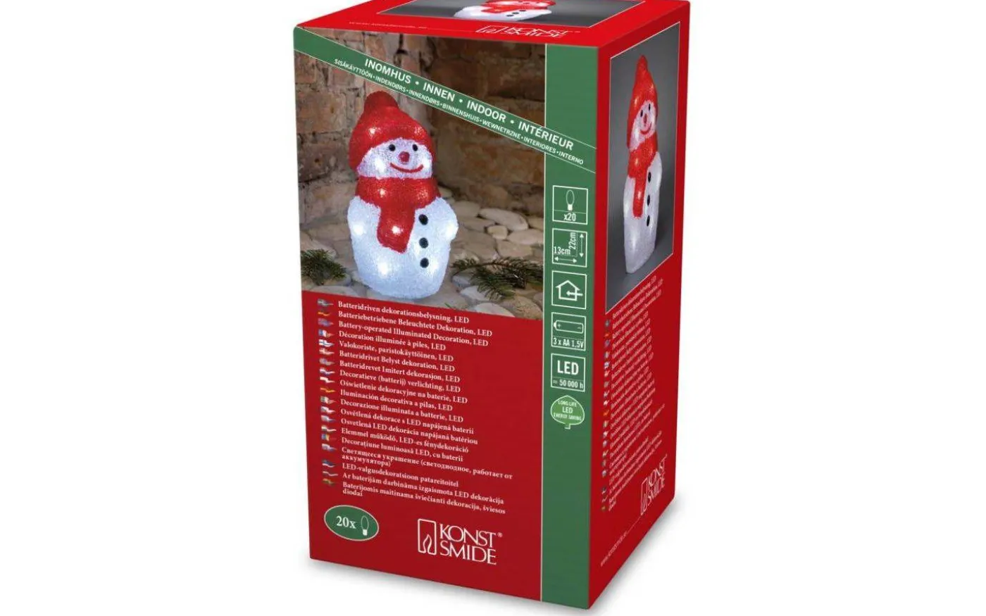 Batteridriven snögubbe från Konstsmide i akryl för inomhusbruk. Snögubben har 20st små LED-lampor som lyser i ett vitt ljussken. Drivs med 3st AA-batterier, dessa köpes separat. Se passande förslag under ”Tillbehör”.