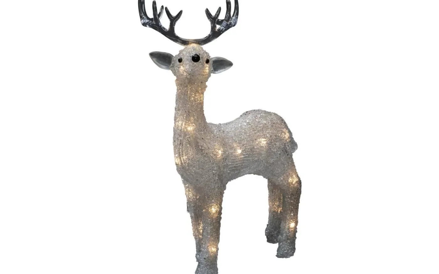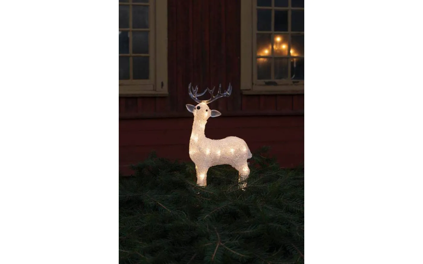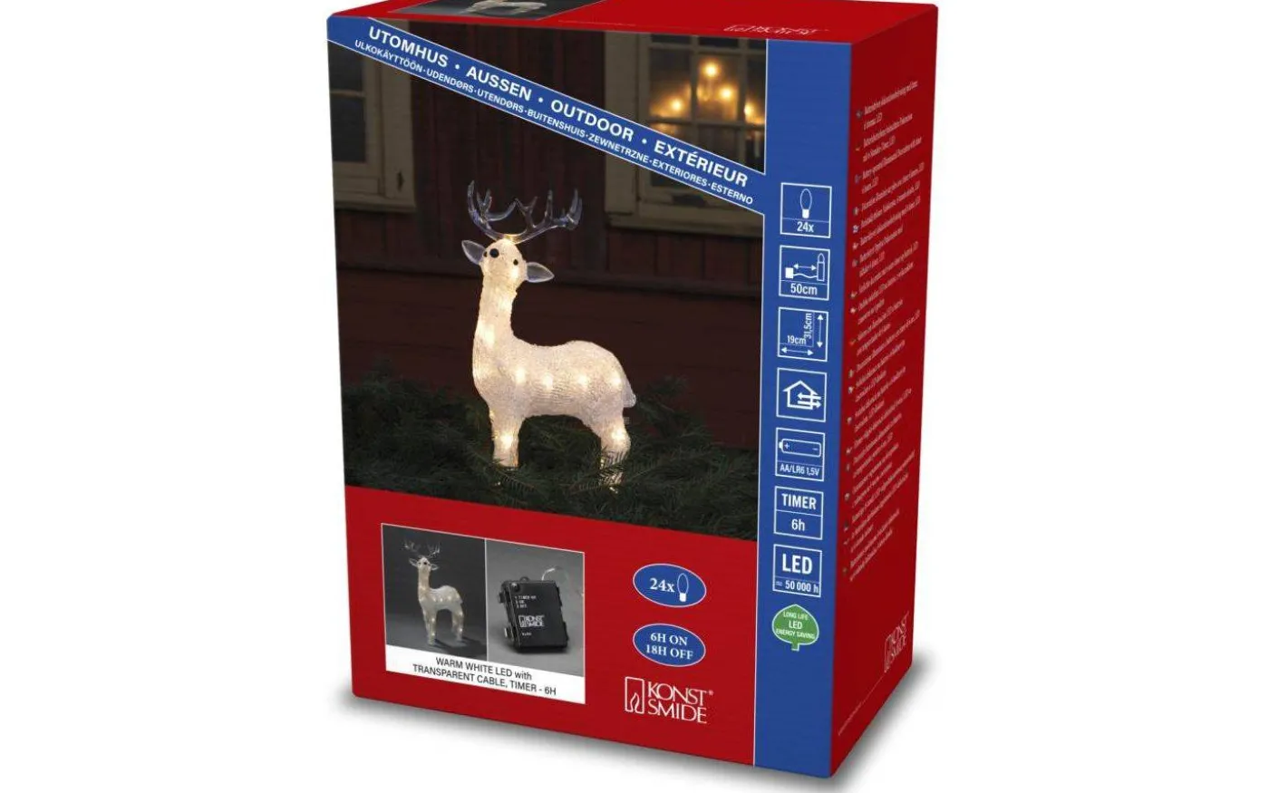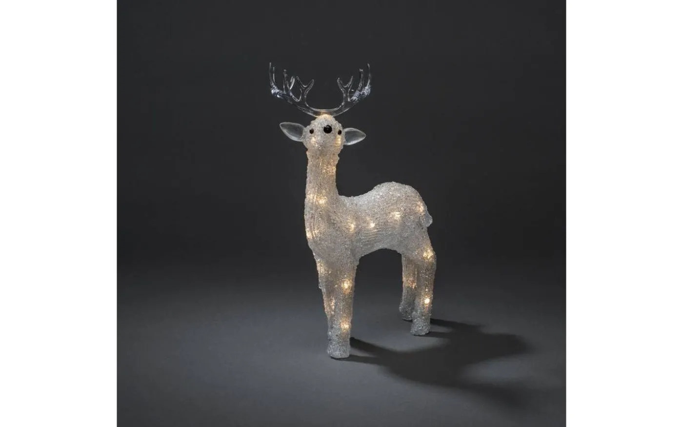Söt liten batteridriven ren i akryl från Konstsmide för utomhusbruk. Renen har 24st små LED-lampor som lyser i ett härligt varmvitt ljussken.