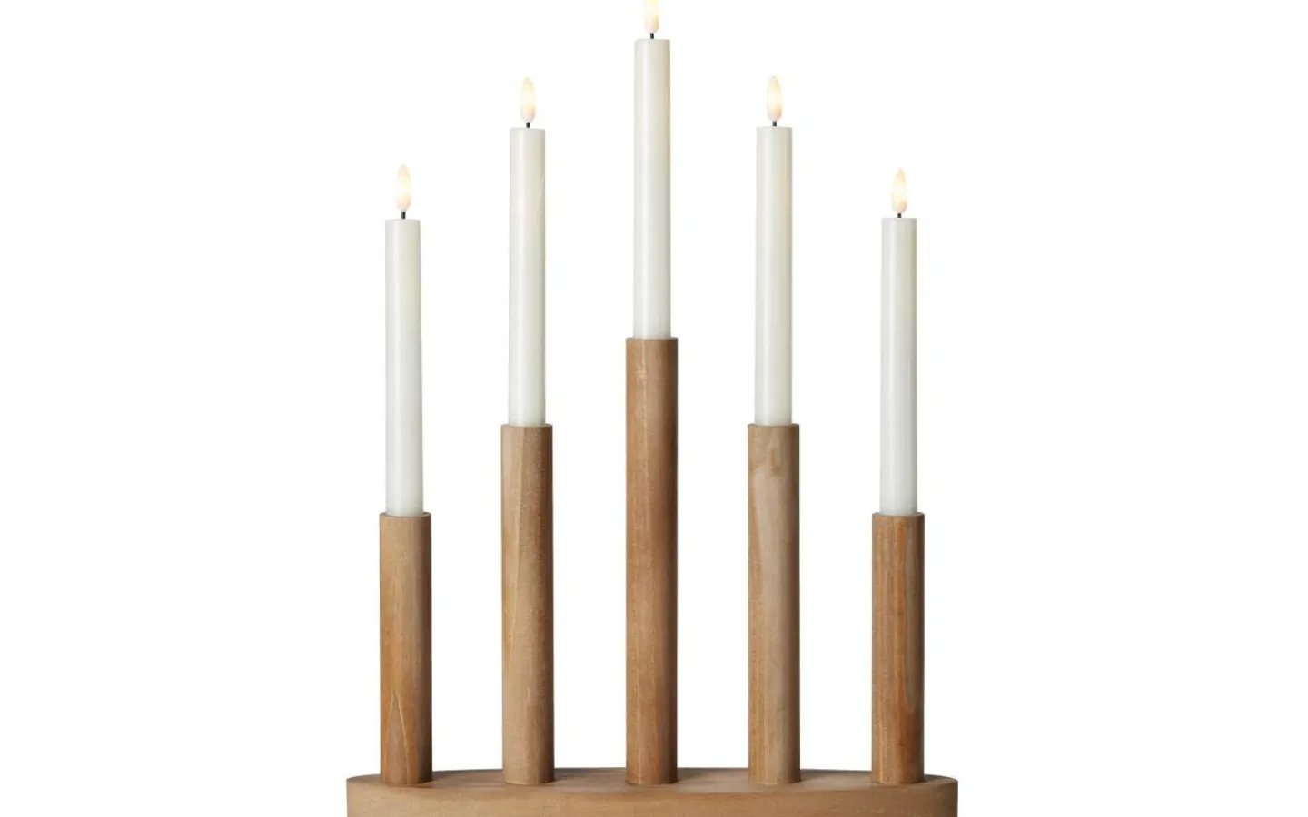 Batteridriven A-formad adventsljusstake tillverkad i trä tillsammans med 5 ljus. On/off med timer finns under varje ljus. När du tänder ljusen lyser de i 6 timmar och tänds automatiskt samma tidpunkt dagen efter.