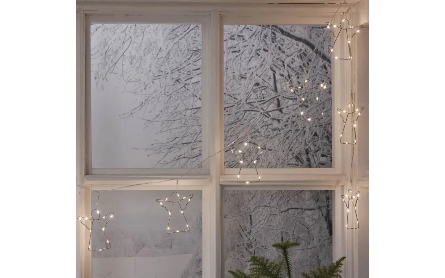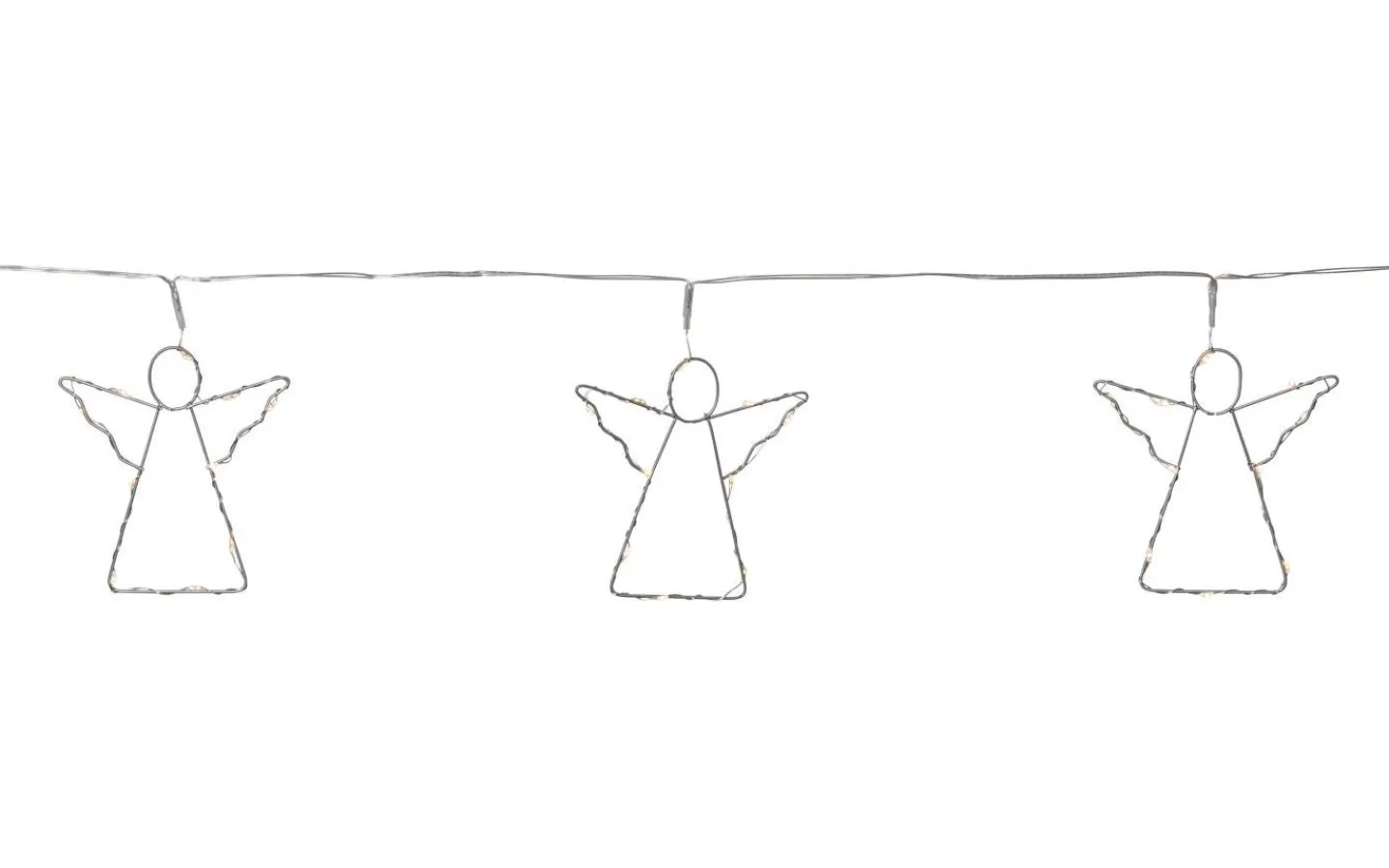 Angela från Star Trading en dekorativ ljusslinga med 8 silverfärgade metallänglar, där varje ängel är upplyst med 10 varmvita LED-lampor. Passar perfekt till jul men är lika fin att använda året runt som en glimrande inredningsdetalj.