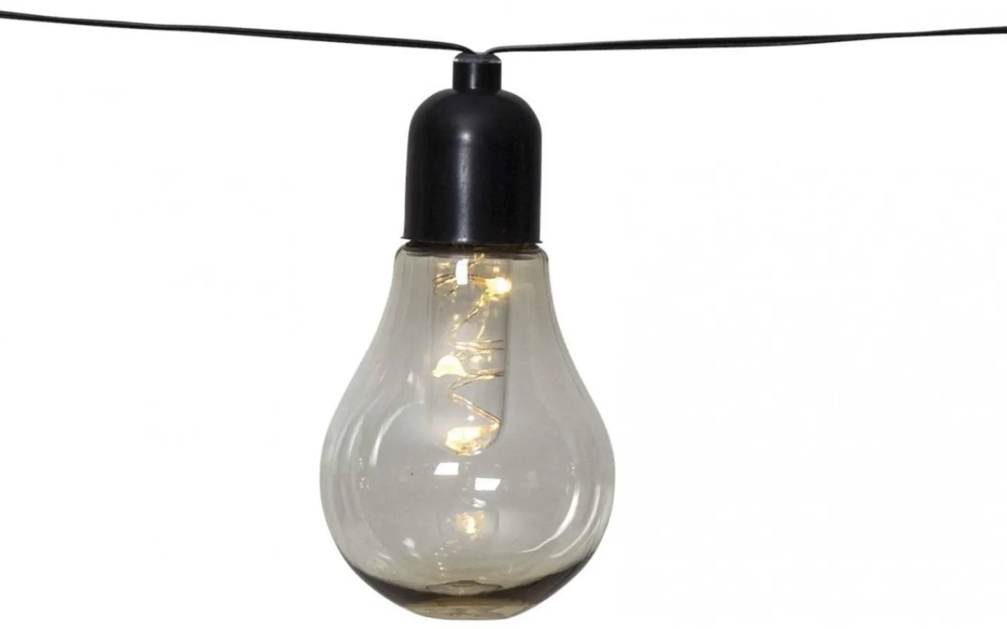 Denna modell av Glow är en dekorativ, batteridriven ljusslinga med lampor designade att se ut som gamla glödlampa i tonad plast. Inne i varje lampa finns en smal spiraltråd med små fina LED-lampor.