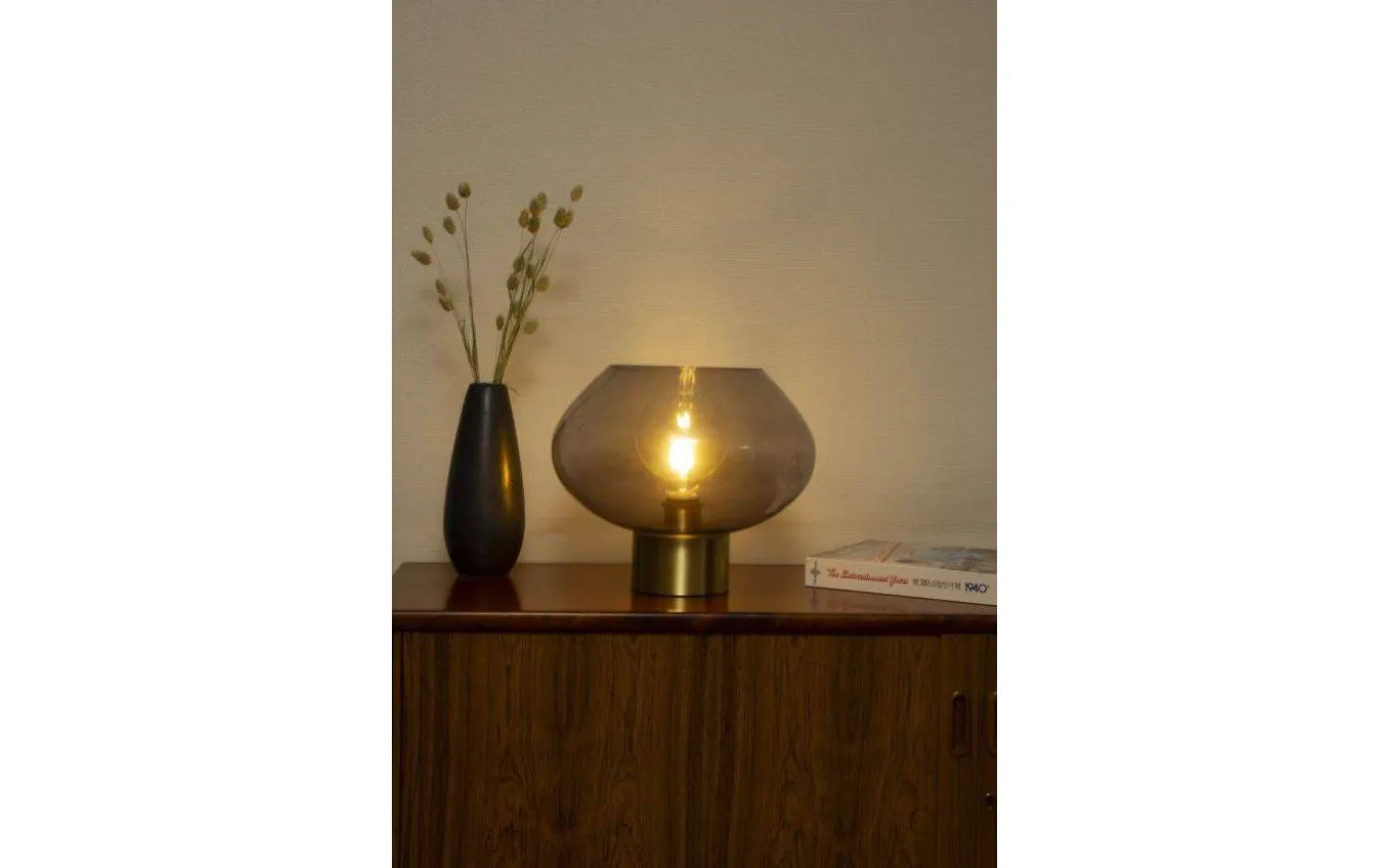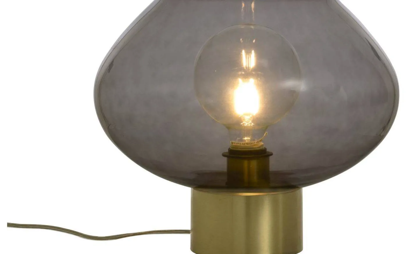 Bell bordslampa i matt mässing och rökfärgad glasskärm. Max 40W E27, ingår ej. Sladd med mellanströmbrytare och stickpropp.