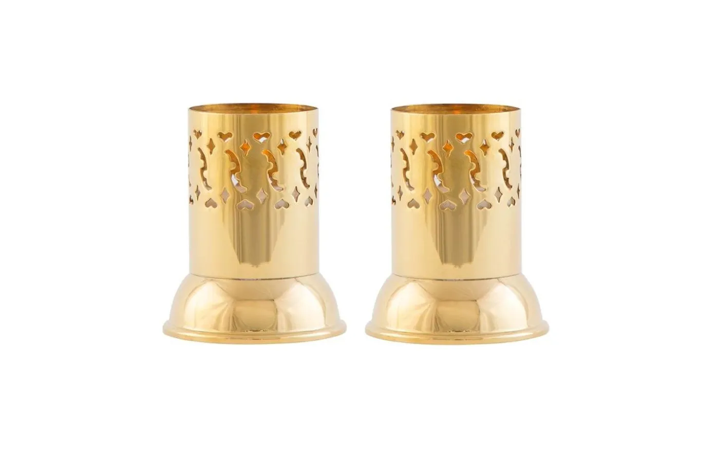 Ett par mindre värmeljushållare. Mässingscylindern har ett stansat mönster som görs i vår äldsta maskin – gallermaskinen som varit med oss ända sedan starten 1884. Polerad mässing 7×6 cm