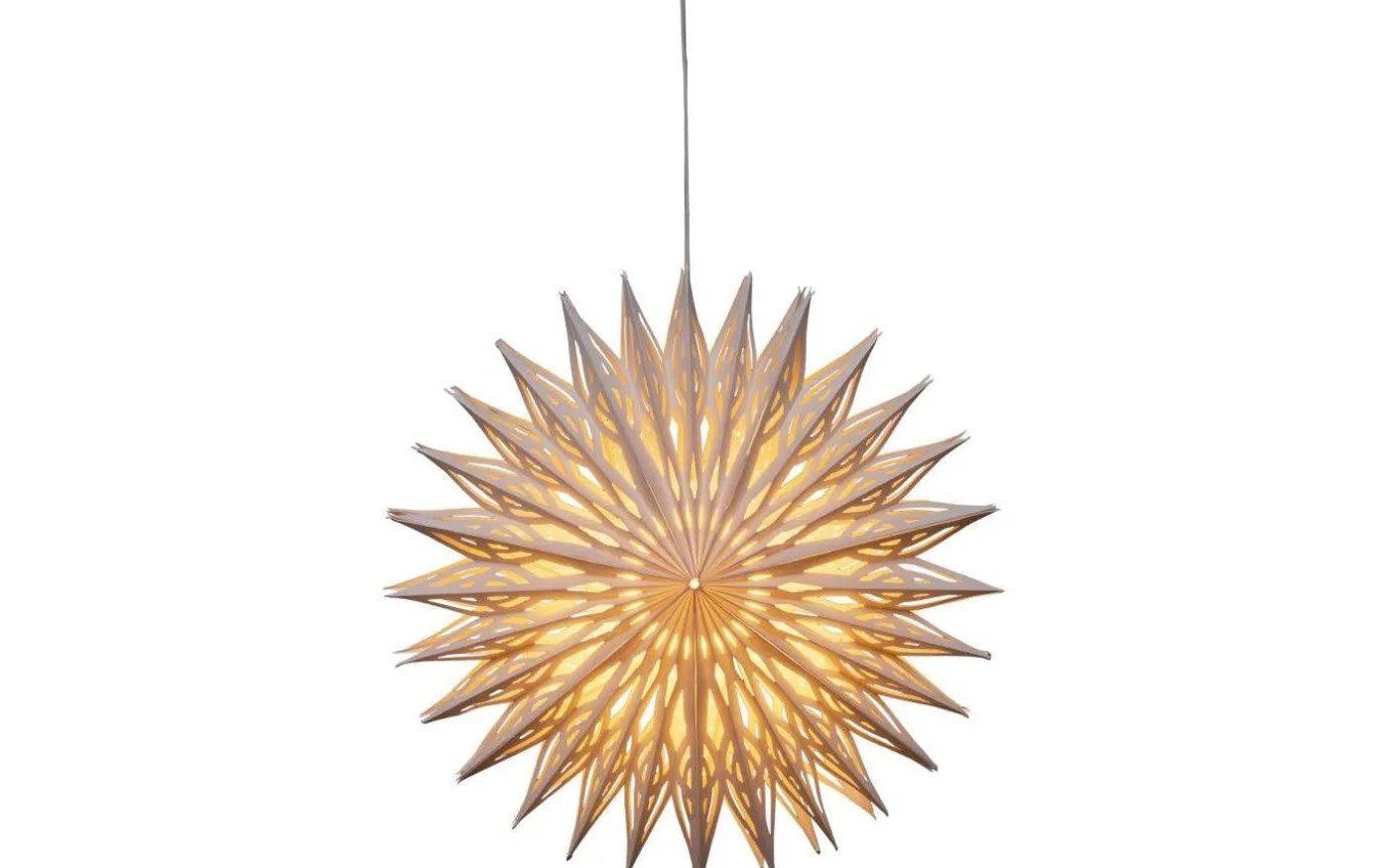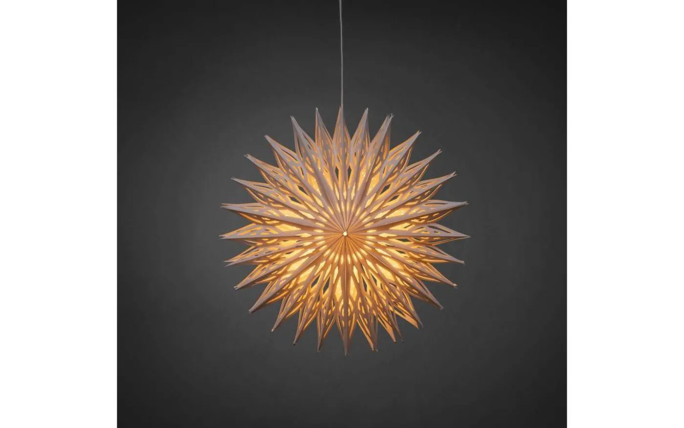 Blom julstjärna från Konstsmide är gjord i papp. Det fina mönstret gör att stjärnan släpper genom ett mysigt ljusflöde.