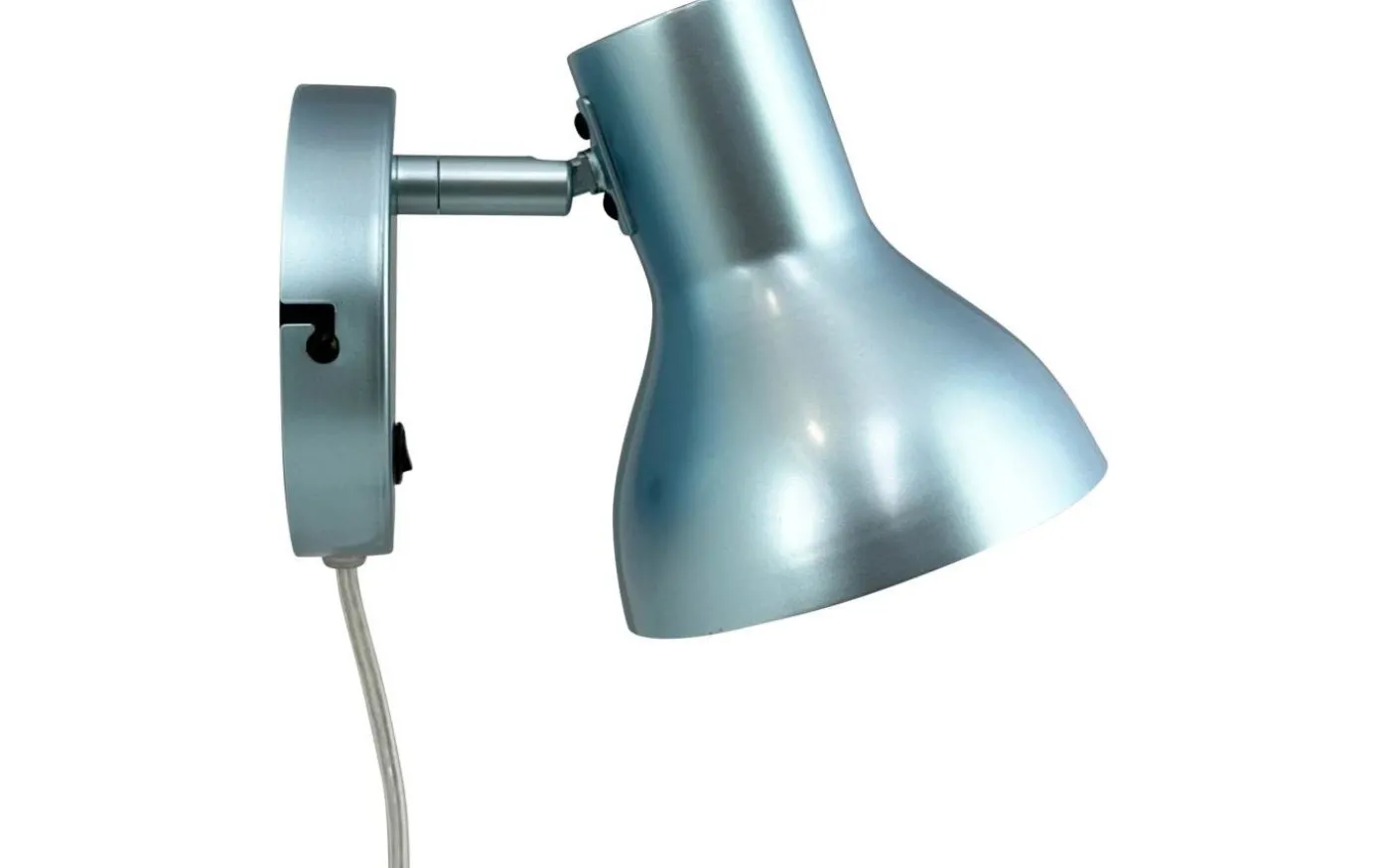 Vägglampa med on/off sidor på väggfot. Metallisk färg. Skärmen kan rotera och luta.