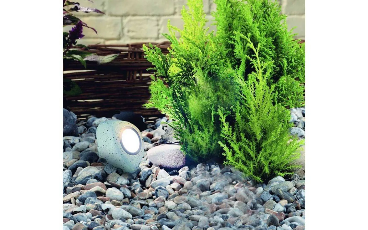 Trädgårdsbelysning av stenliknande material med rostfri ring.