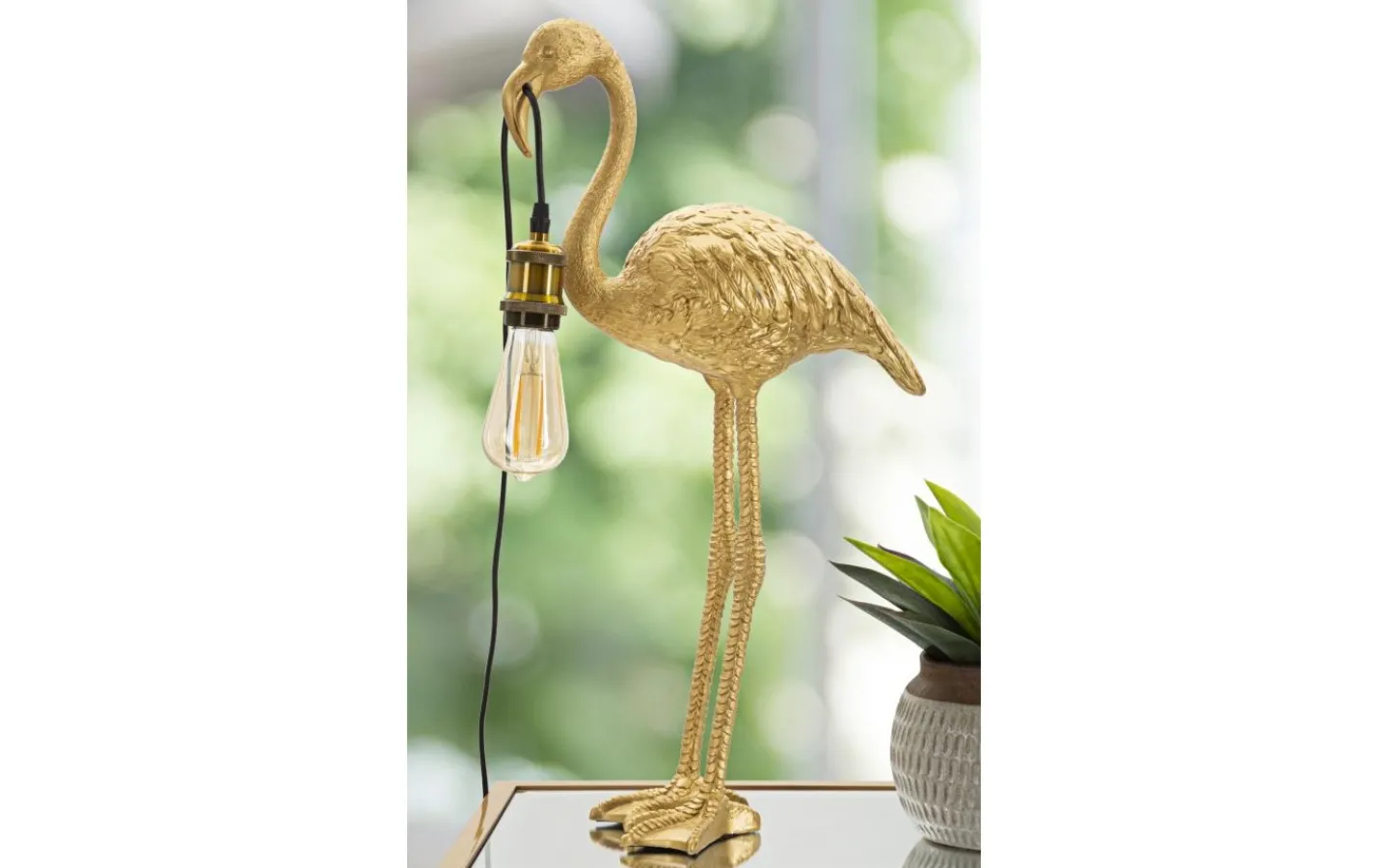 Bordslampa i guldharts som föreställer en söt flamingo som håller i glödlampskabeln med sin näbb. En touch av glädje att kombinera med alla typer av möbler.