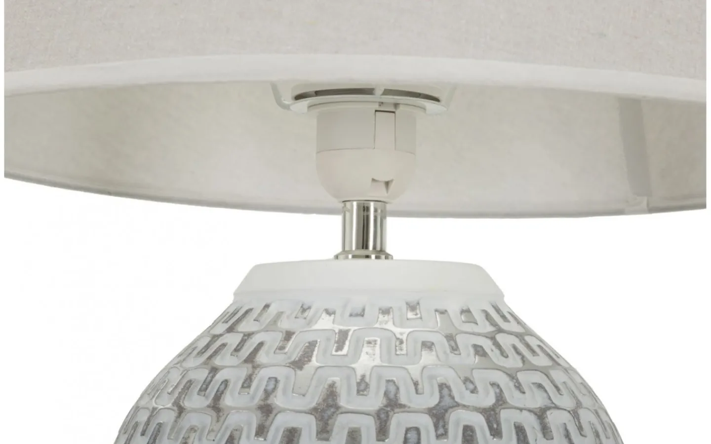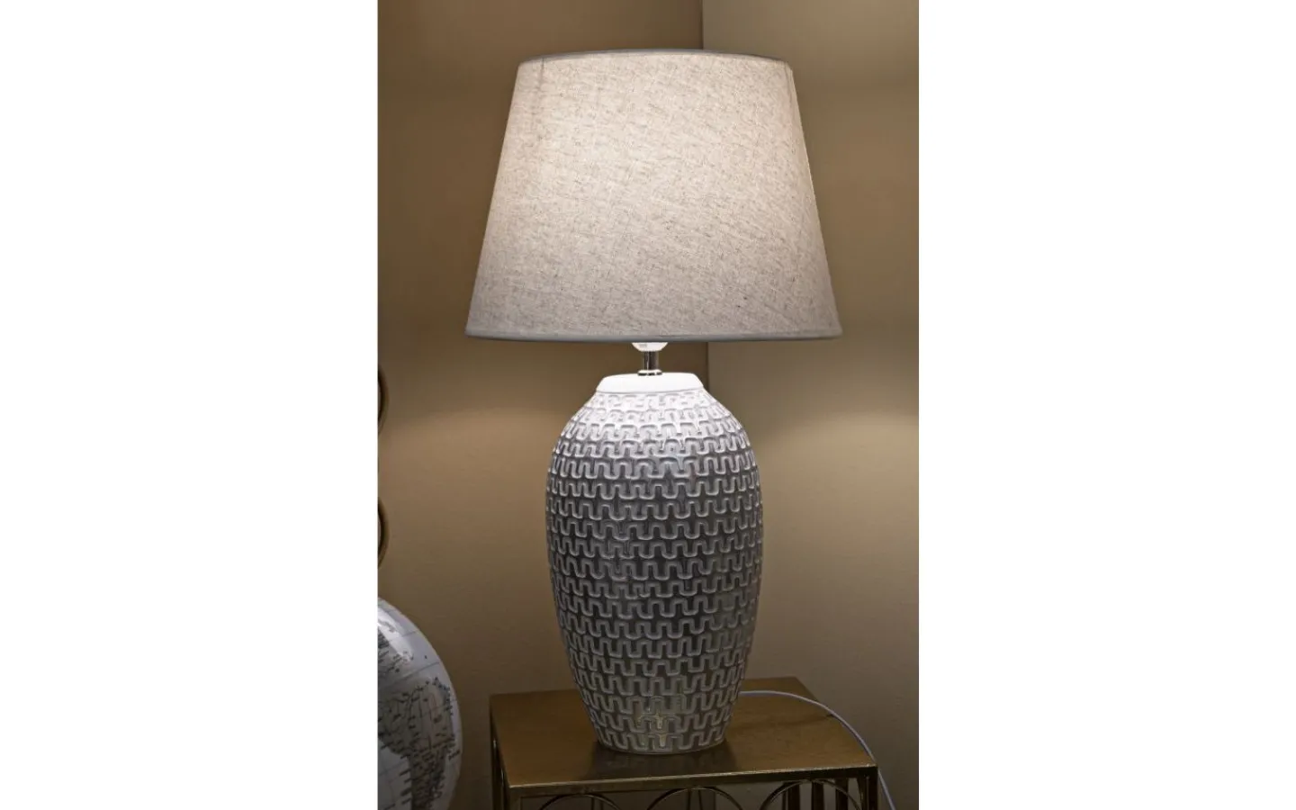 Bordslampa i harts med eleganta geometriska dekorationer i relief. Komplett med lampskärm i vit tyg.