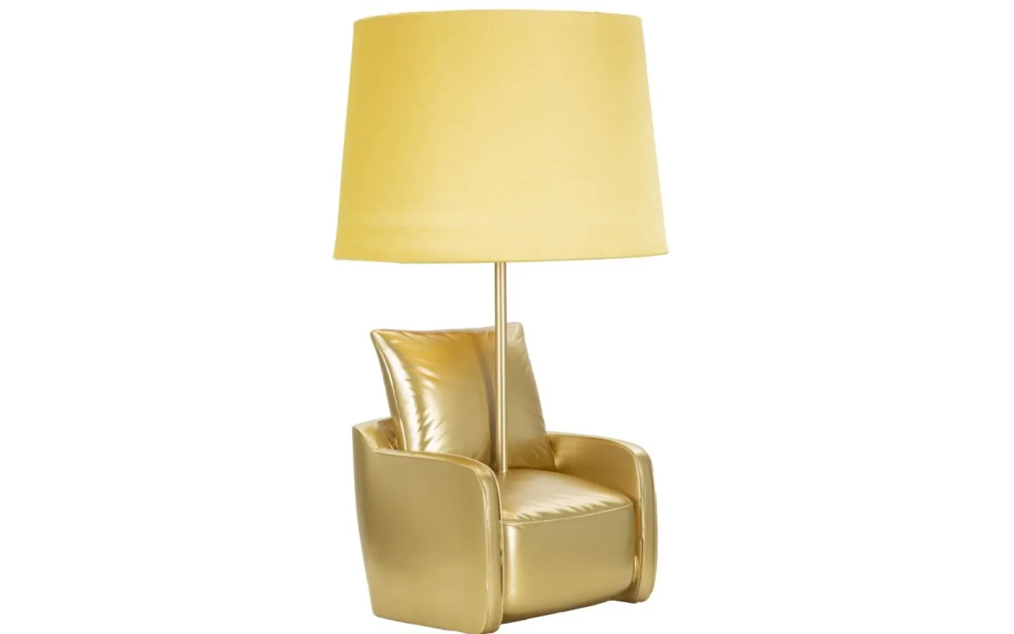 Fåtöljformad bordslampa i gyllene harts inspirerad av 70-talet. Komplett med lampskärm i gult ockra tyg.