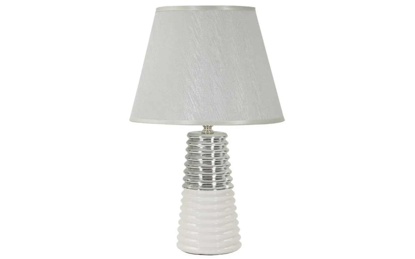 Bordslampa i vit och silverkeramik elegant dekorerad med koncentriska cirklar. Komplett med silvertyg lampskärm.