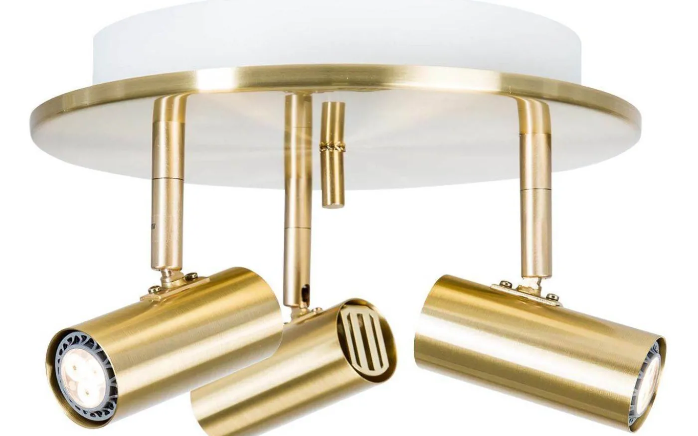 Cato takspotlight passar perfekt i rum och utrymmen där du vill belysa flera olika delar av rummet samtidigt då du enkelt riktar de 3 lamphuvudena i önskad riktning. Taklampan är tillverkad av metall med en finish i blankslipad mässing.