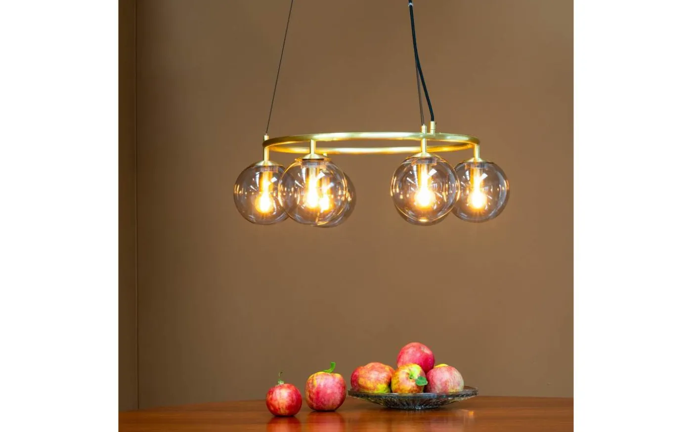 Taklampa med rökta glaskupoler. Upphängning med vajer, metallrosett.