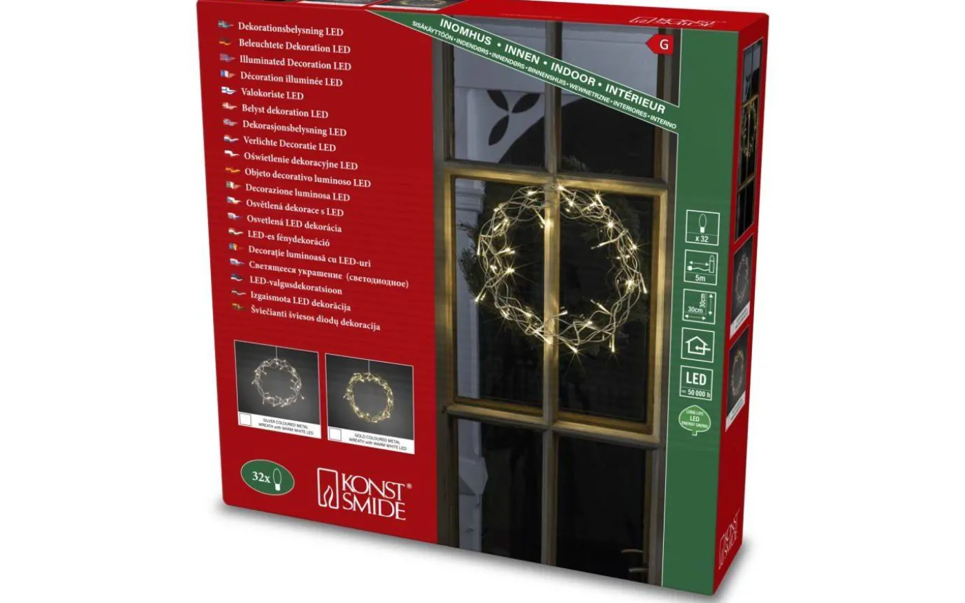 Kransen har 32 stycken små fina LED-lampor som avger ett dekorativt varmvitt ljussken. Levereras komplett till dig med 5 meter lång sladd med transformator och stickkontakt för vägguttag.