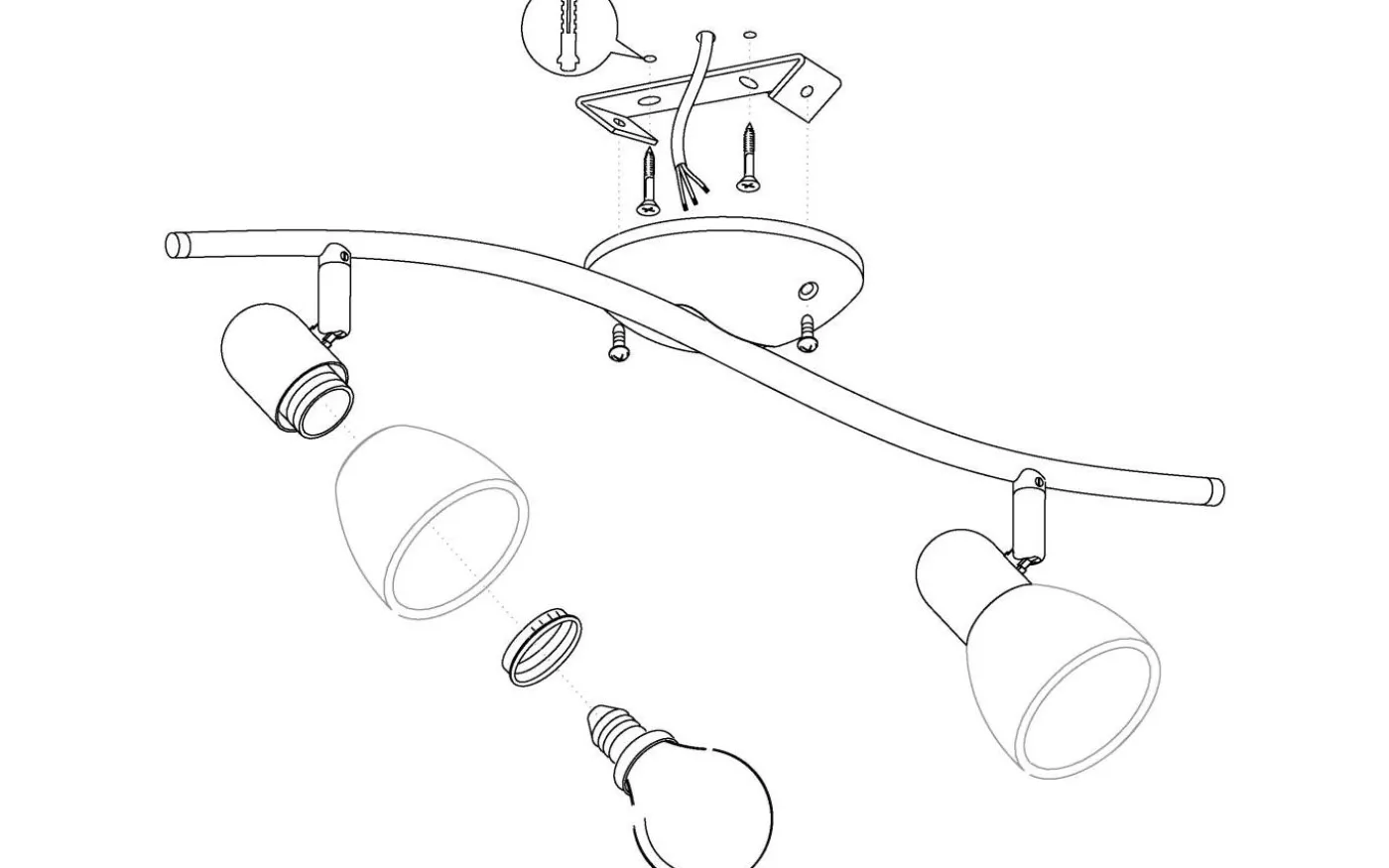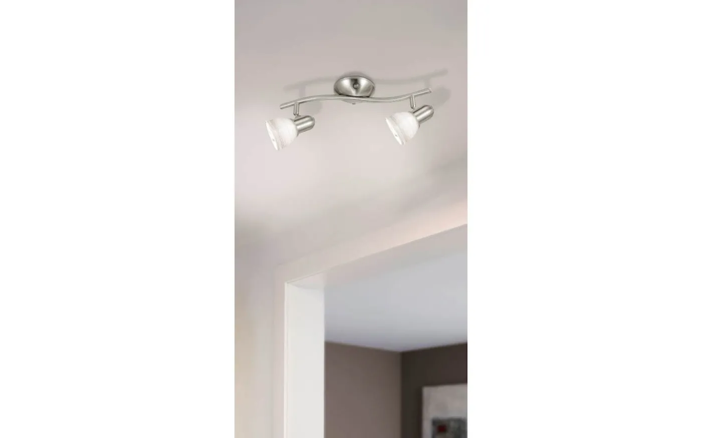 Taklampan DAKAR 1 har en mjukt böjd metallstomme i matt nickel i kombination med två justerbara spotlights. Strålkastarna har vita glasskärmar dekorerade med en avtorkningsteknik och kompletterar moderna inredningsstilar. Med sina svängbara lamphuvuden fungerar den klassiska takspotlighten bra i alla utrymmen, oavsett om det är köket, vardagsrummet, sovrummet eller hallen.