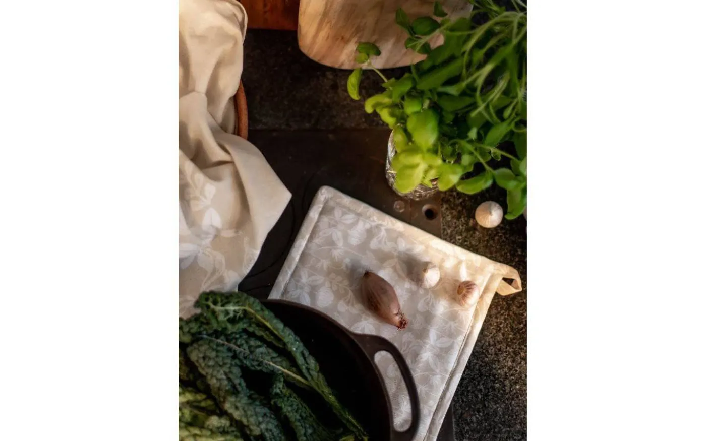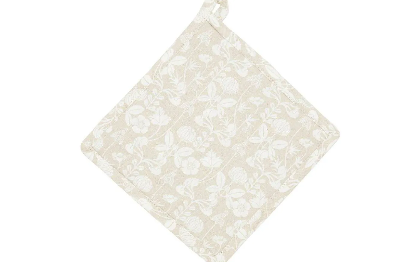 Grytlappen i bomullsväv med tryckt mönster av Carl Larsson. Mönstret De mina kommer från försättningsbladet på några av Carl Larssons böcker, bland annat boken ’De mina’. Grytlappen är 22x22cm och med en ögla att hänga upp den i.
