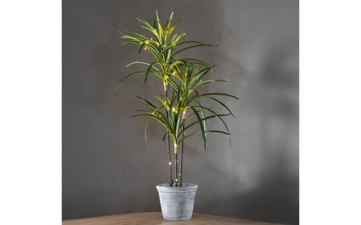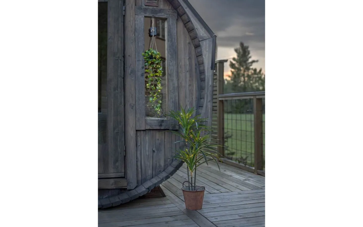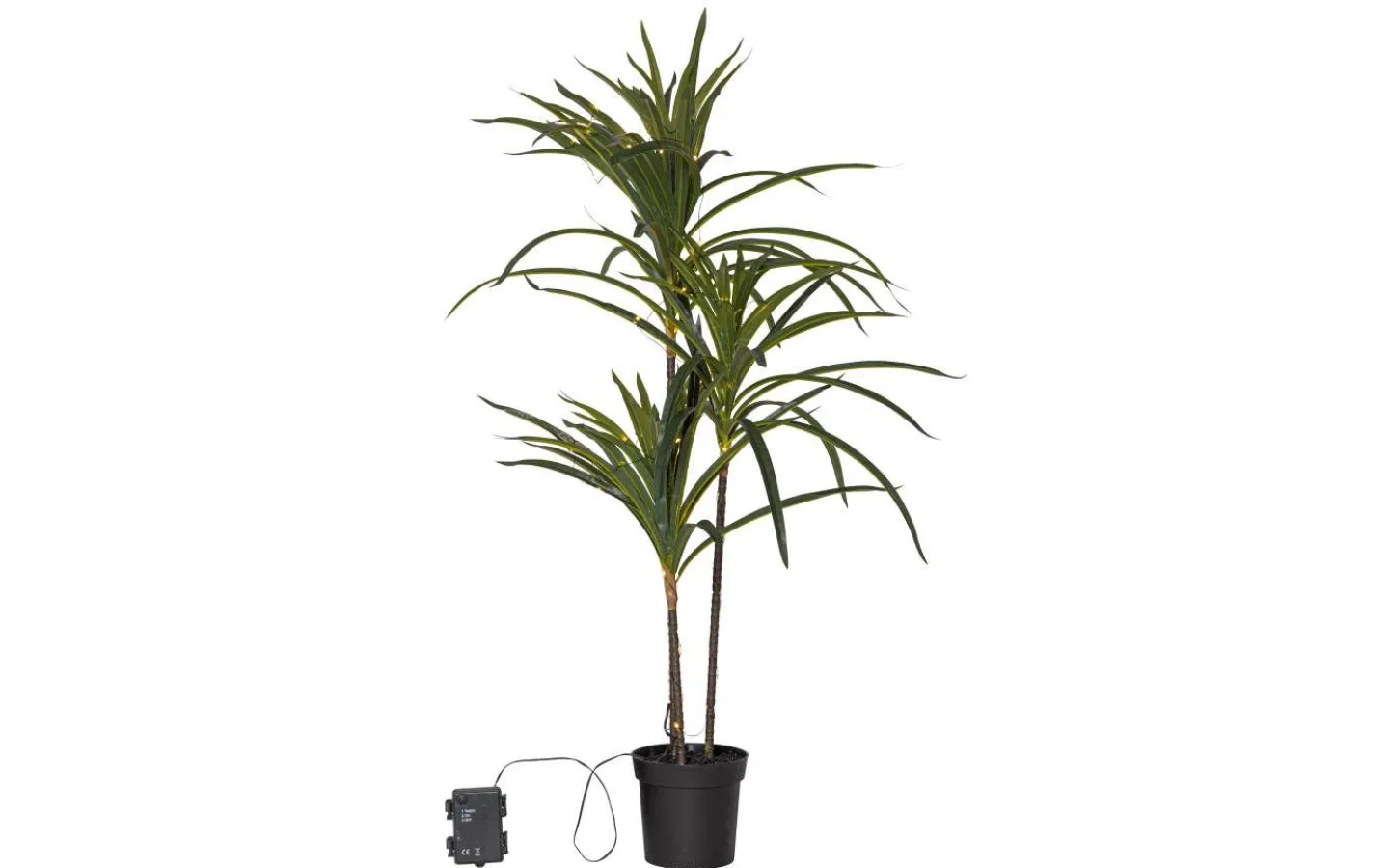 Dekorativ konstträd med dew drop slinga, 50 varmvita ljuspunkter ger ett fint sken. Perfekt grönska för hemmets lite mörkare vrår, passar även utomhus då batteridosan är tillämpad för utebruk. Svart plastkruka för enkel placering. 3 batterier AA ingår ej. Batteritid ca. 80h.