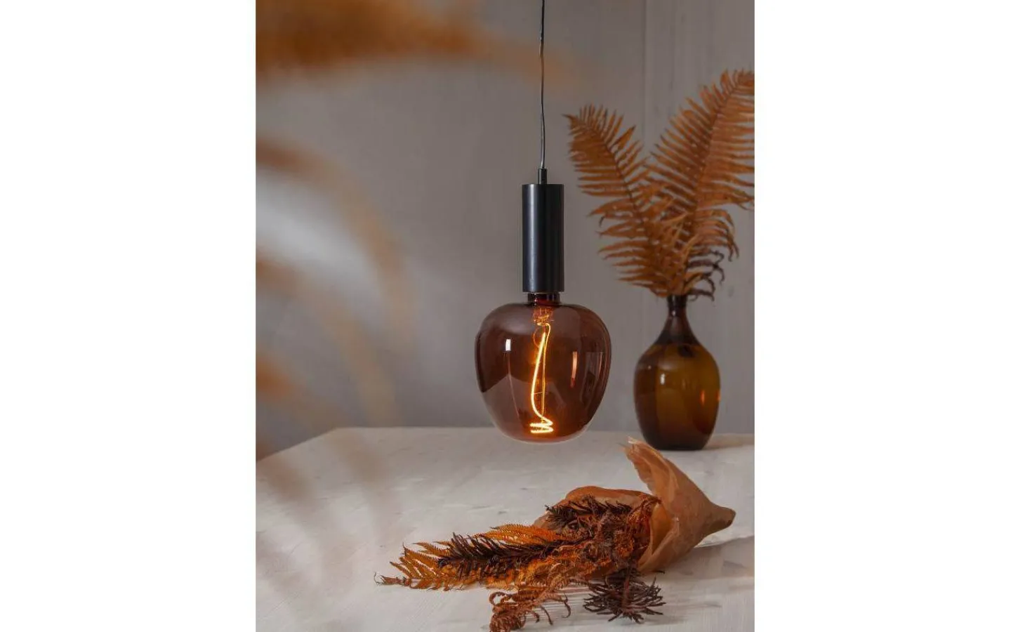 En vacker ljuskälla med låg ljusstyrka och mörkbrunt glas. Dekorativ lampa som hängs över matsalsbord eller soffbord. Stående blir denna lampa en mysig dekorationsbelysning som passar perfekt i våra lampfötter. Hittar sin självklara plats över såväl bardiskar som över matsalsmöbel. Kan hänga själv eller i ett arrangemang med 355-15 G125 Cognac Apple.