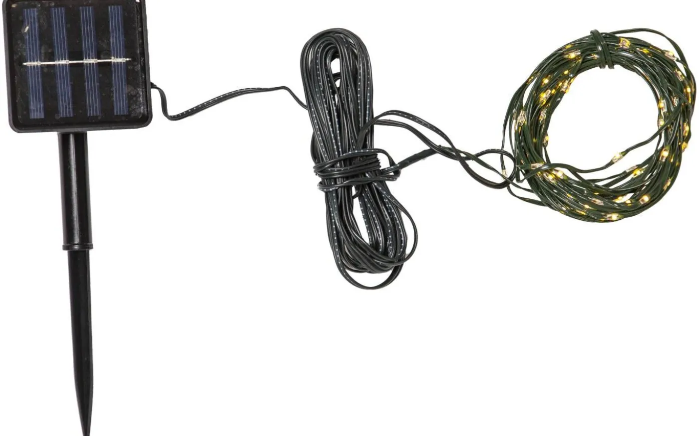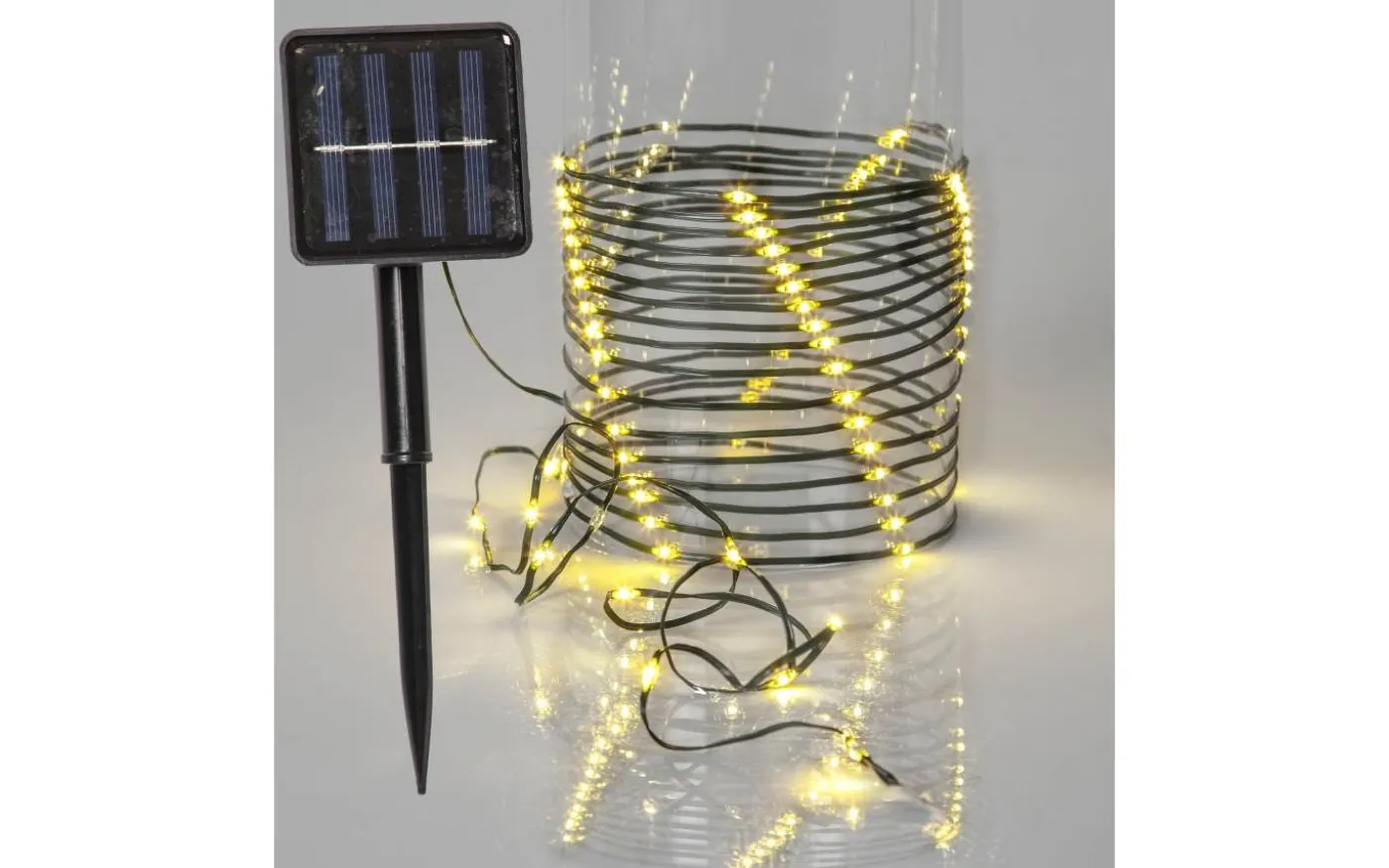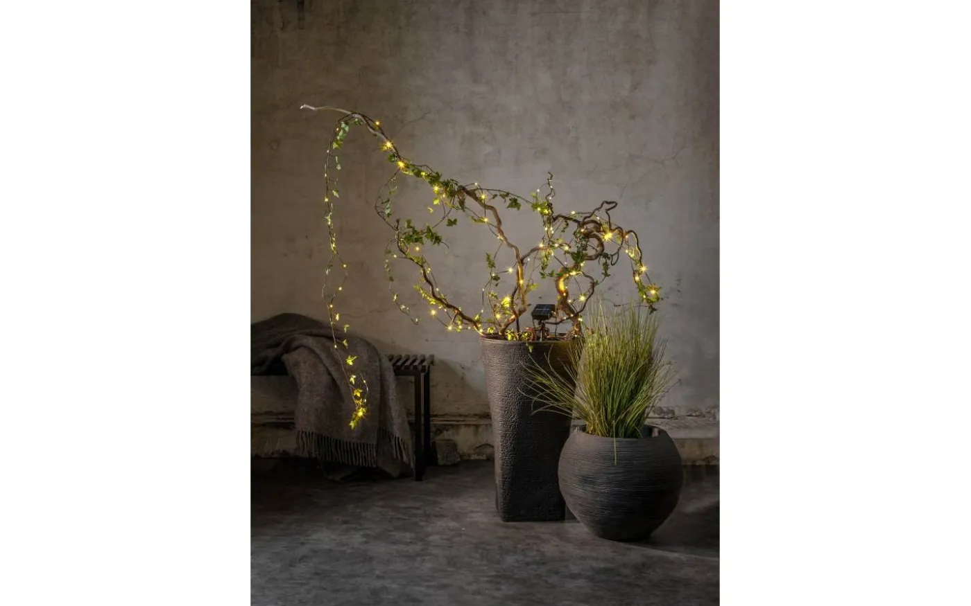Solcellsdriven Dew Drop slinga med 100 varmvita micro LED ljuspunkter. Den tunna, gröna kabeln är flexibel och smälter in i grönska och mörker – perfekt för buskar, räcken eller balkonger.