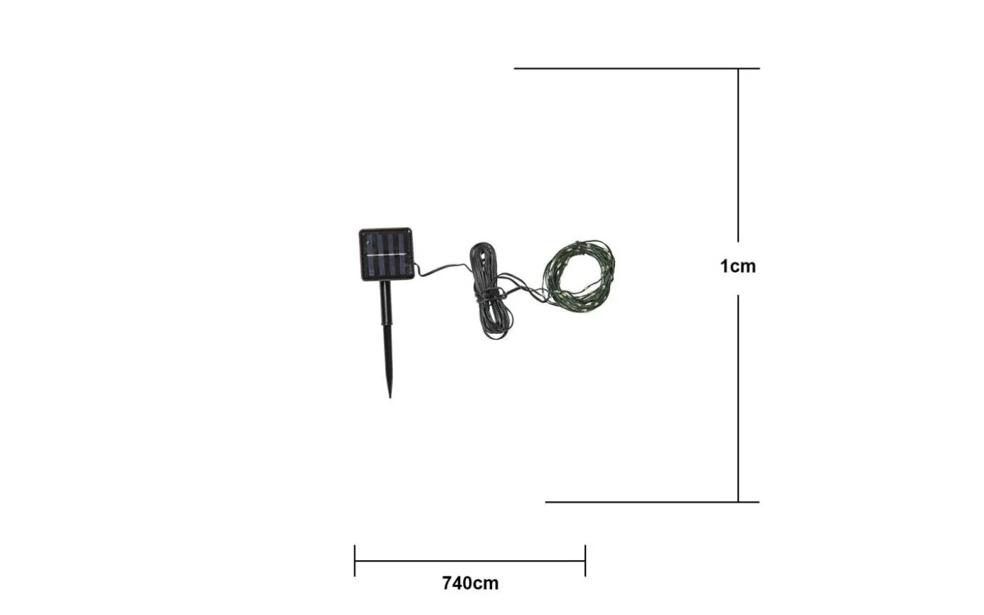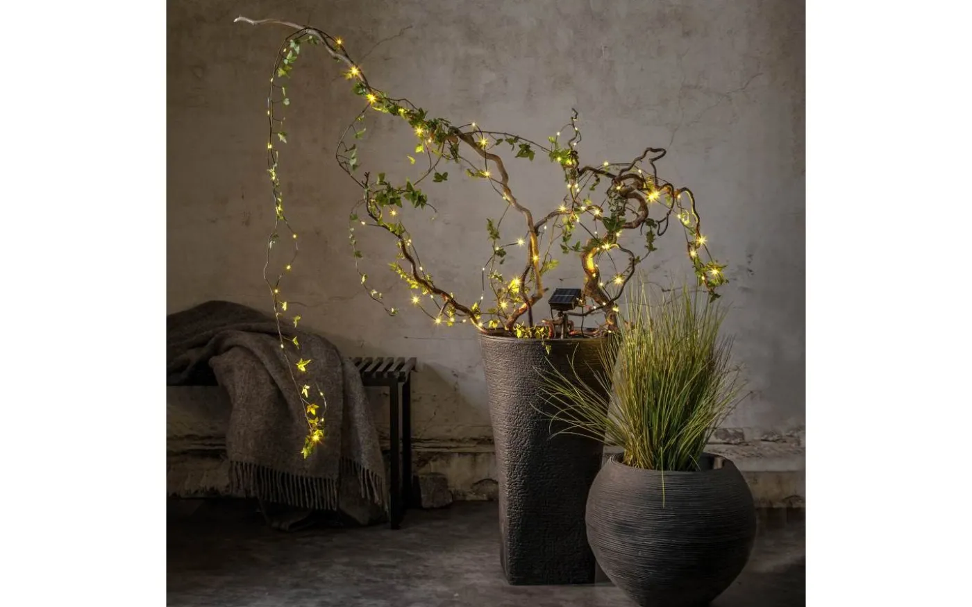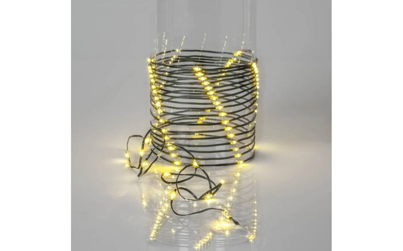 Solcellsdriven Dew Drop slinga med 100 varmvita micro LED ljuspunkter. Den tunna, gröna kabeln är flexibel och smälter in i grönska och mörker – perfekt för buskar, räcken eller balkonger.