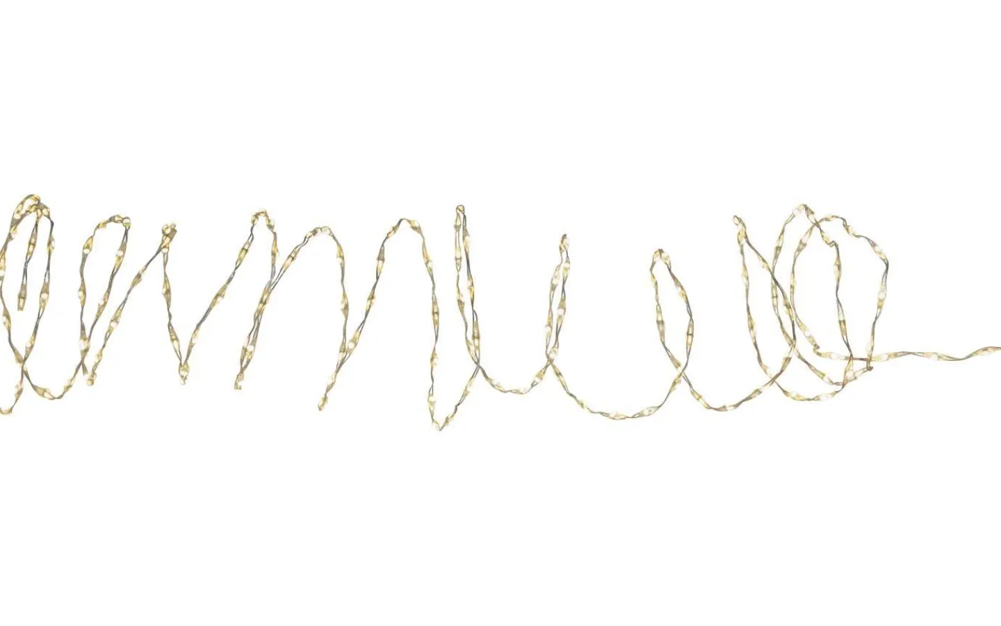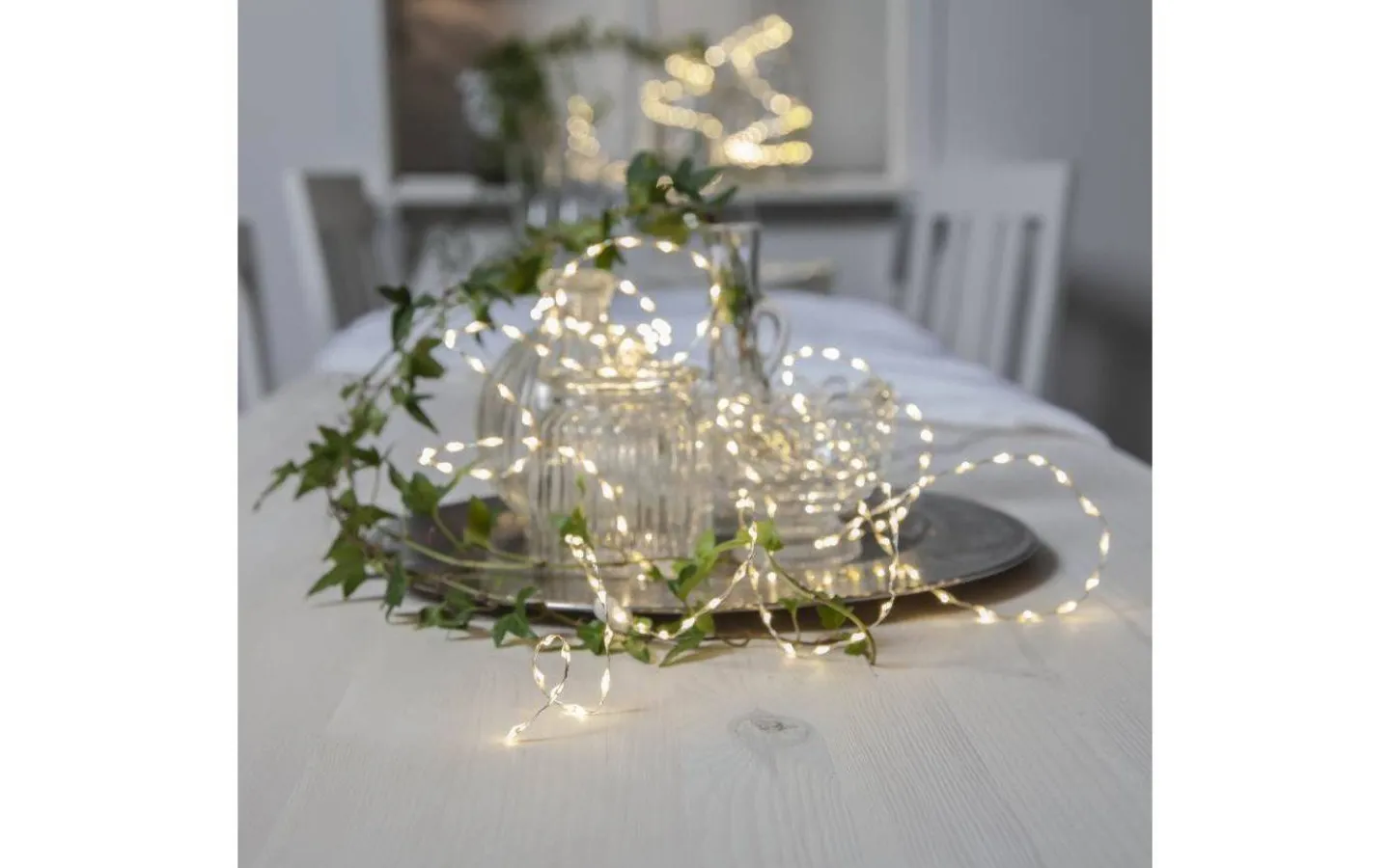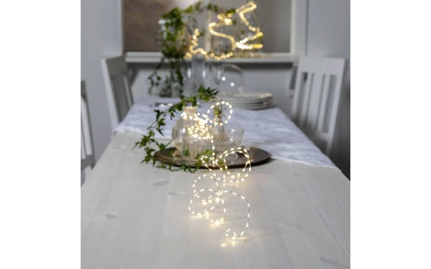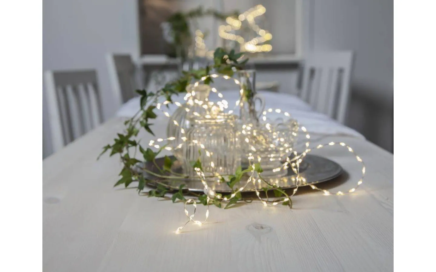 Dew Drop Mold ljusslnga från Star Trading är en dekorativ ljusslinga med 150 stycken små LED-lampor som lyser i ett vackert varmvitt ljussken. Perfekt att använda vid exempelvis dukningar, blomsterarrangemang, i fönster eller som en julgransslinga. Slingan är silverfärgad och 2,25 m lång, med en lite styvare kabel som är lätt att forma.