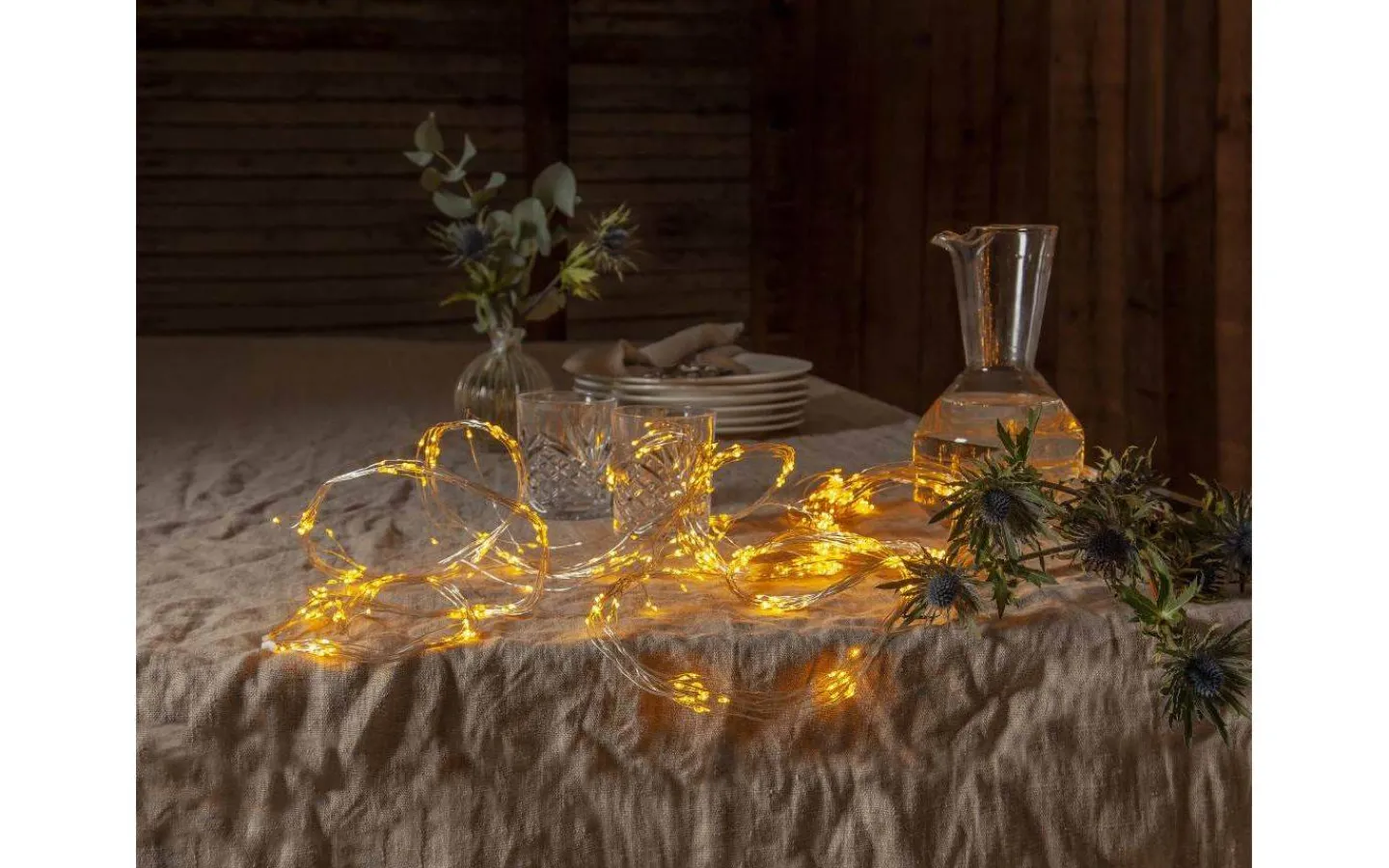 Dew Drop från Star Trading är en ljusslinga gjord av metall. Slingan har 360st små varmvita LED-lampor fördelade på 23 stycken 2m långa strängar. Perfekt att använda vid exempelvis dukningar.