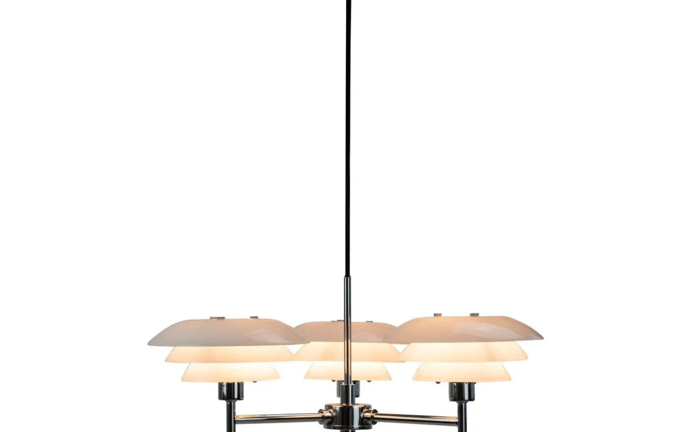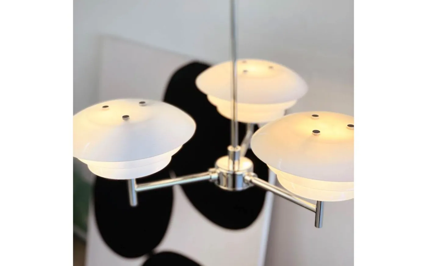 DL20 Opal ljuskrona med krom/metallupphängning är en fantastisk ljuskrona som hänger mycket elegant över matbordet. Ljuset lyser vackert genom de 3 olika storlekarna av nyanser och ger en mycket behaglig känsla i rummet. Tack vare skärmarnas placering kommer ljuset inte att förblinda dig utan skapar en mysig atmosfär i rummet. Ljuskronan levereras med en 3m svart tygsladd som ger en fin kontrast till opalglaset.