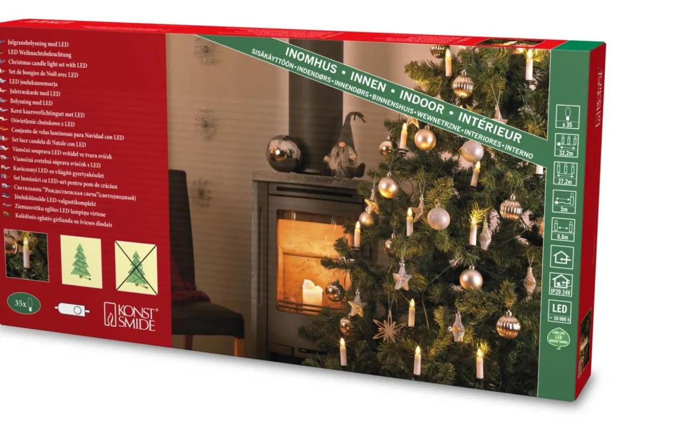 Julgransslinga med en traditionell look från välkända Konstsmide. Denna ljusslinga har 35st vita ljus och är anpassad utomhusbruk. Varje ljus avger ett dekorativt varmvitt ljussken.