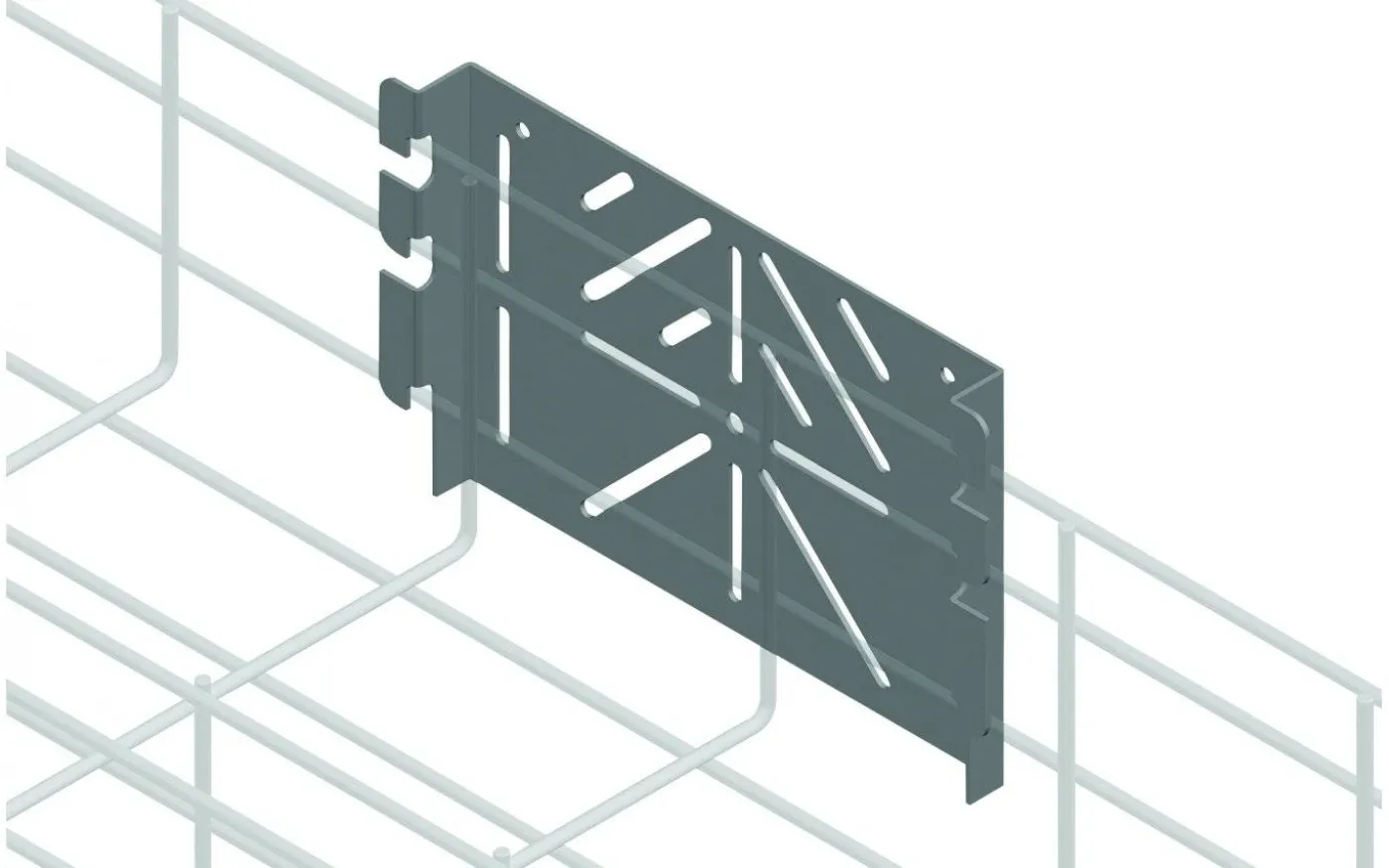 Dosplåt med slitsade spår för montage av större kopplingsdosor eller utanpåliggande vägguttag. Passar samtliga trådstegar. Sendzimirgalvaniserad (förgalvaniserad) med korrosivitetsklass C2. Fästet låses mot trådstegen med klämmor som böjs ned.