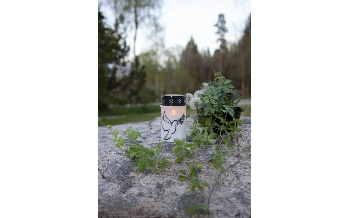 Gravljus med tryckt mönster i form av en flygande Duva. Höjd 12cm. Extra lång livslängd; 2500 timmar och med inbyggd timer. 2 batterier C ingår ej. Batteritid ca. 2500h.